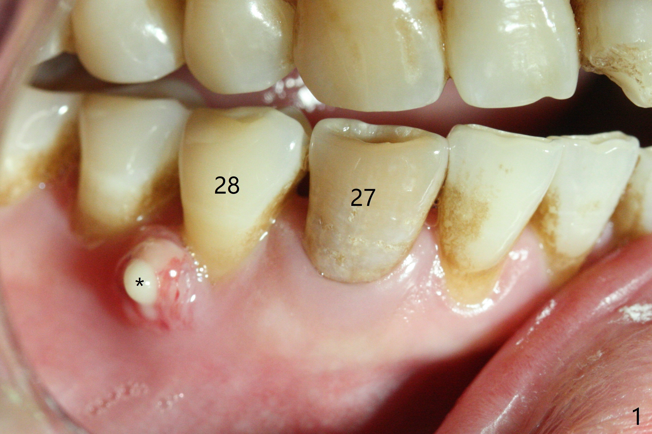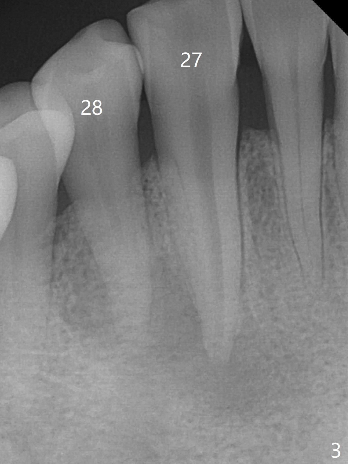 A 47-year-old woman with autoimmune hepatitis has a fistula distal to the tooth #28 (Fig.1). Periapical radiolucency appears to involve the teeth #27 and 28. Which is the infected tooth? Treatment plan?