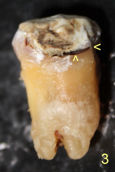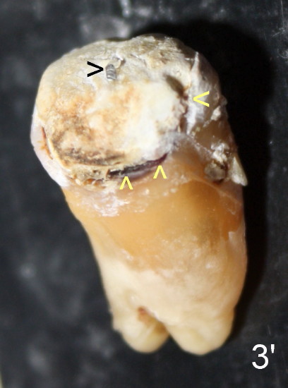 Open margin is more obvious in the extracted tooth (Fig.3, 3' yellow <). Black > points to a post. Return to main text