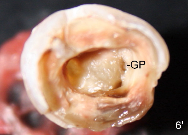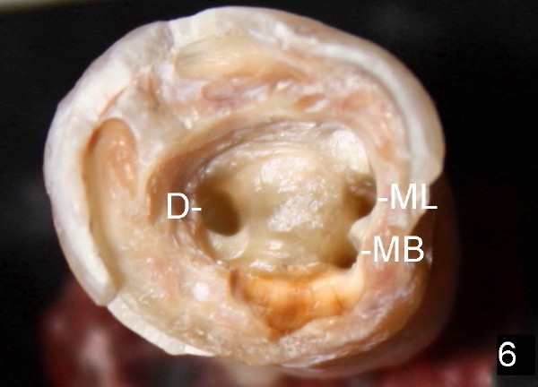 Fig. 6' shows the pulpal chamber after initial removal of gutta percha from mesiolingual (ML) canal. This indirectly demonstrates that MB canal was not filled/missing before, as compared to Fig.6, when canal debridement is near finishing. Return to main text