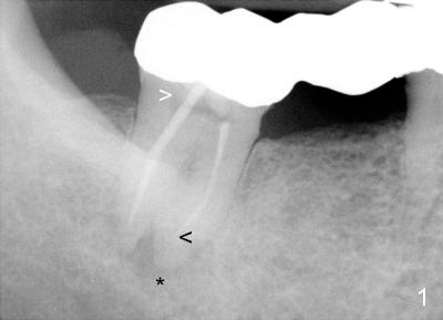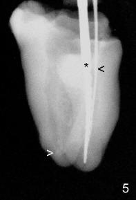 The most apical portion of the distal canal is found to be blocked (Fig.5 white >) when filling material is removed. The blockage is pre-existing, since it is present in Fig.2 and 4. The mesiobuccal canal (Fig.5 black <, #10 hand file) fuses with the mesiolingual canal (*, 30/.06 rotary file) before exit at apical foramen.