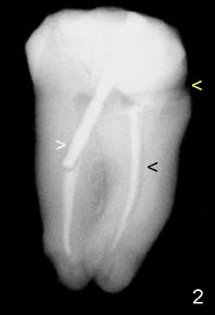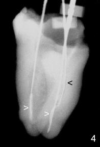 The void in the mesial root turns out to be a missing mesiobuccal canal (Fig.4,5 black <). Initially, RCT filling material is difficult to remove from apical portion of the distal and mesiolingual canals (Fig.4 white >), while the apical portion of the mesiobuccal canal is obliterated.