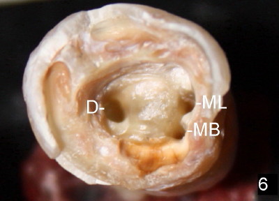 Fig.6 show the pulpal chamber with three orifices: MB (mesiobuccal), ML (mesiolingual) and D (distal) near the end of canal debridement.