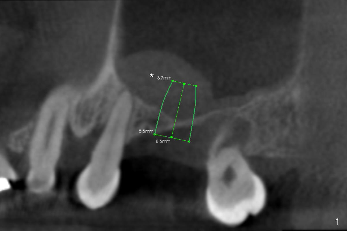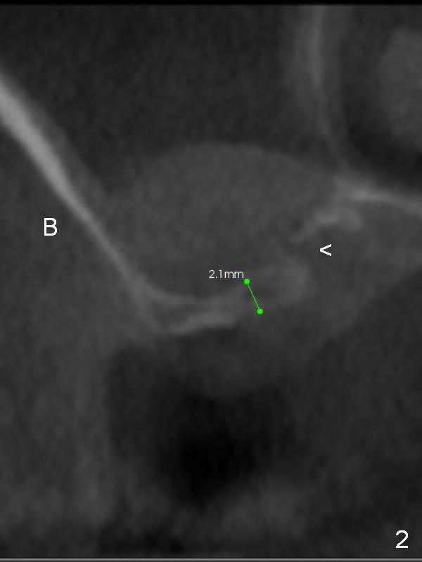 A 48-year-old lady has severe bilateral sinus pneumotization, especially at the right 1st molar (Fig.1 CBCT). The sinus floor is 2 mm thick (Fig.2 coronal section). Sinus lift may require lateral window approach (Fig.2 B (buccal). Implantation may be accomplished at the same time (Fig.1). * in Fig.1: mucocele; < in Fig.2: possible perforation. An implant will be placed at #31 later.