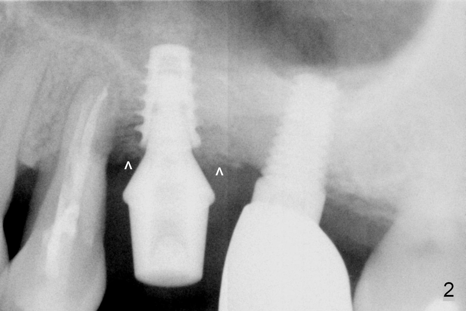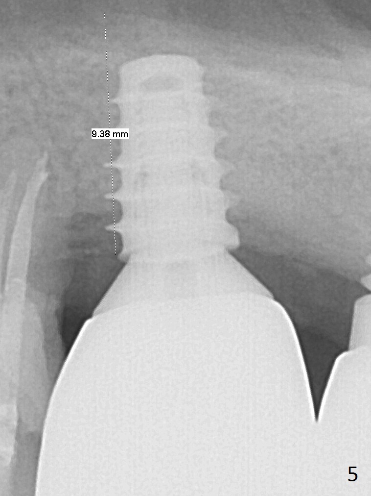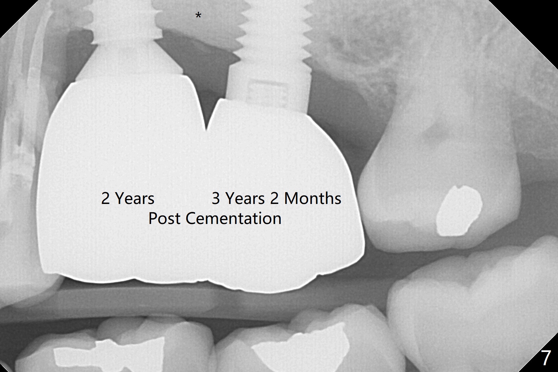 Four months post bone graft, the bone height at #14 is ~ 5 mm (Fig.1). After osteotomy for 4 mm with 4.3 mm Magic Drill (hard bone), Magic Sinus Lifter is used for sinus lift for ~ 8 mm without sinus membrane perforation. Perforation occurs with pulsating hemorrhage after sinus lift with allograft (.5-1 mm, mixed with Metronidazole). Collagen plug is used to repair the perforation before placing a short (5x7 mm) IBS implant with ~ 25 Ncm (Fig.2). After placing a 6.5x5.7(3) mm abutment, allograft is placed around the most coronal exposed implant thread (^). Acrylic is applied over the abutment for wound protection. There is mild nasal hemorrhage for 2 days postop. To prevent and treat sinus membrane perforation, PRF will be routine prepared preop for future cases. New bone forms apically and coronally 4.5 months postop (Fig.3,4 ^). A new temporary crown is fabricated so that it can undergo progressive loading for a few months before final impression. The definitive restoration is delivered 7.5 months postop (Fig.5). The bone density apical to the implant becomes apparently denser nearly 5 months post cementation (Fig.6). The bone density in the crest increases 2 years post cementation (Fig.7 *).