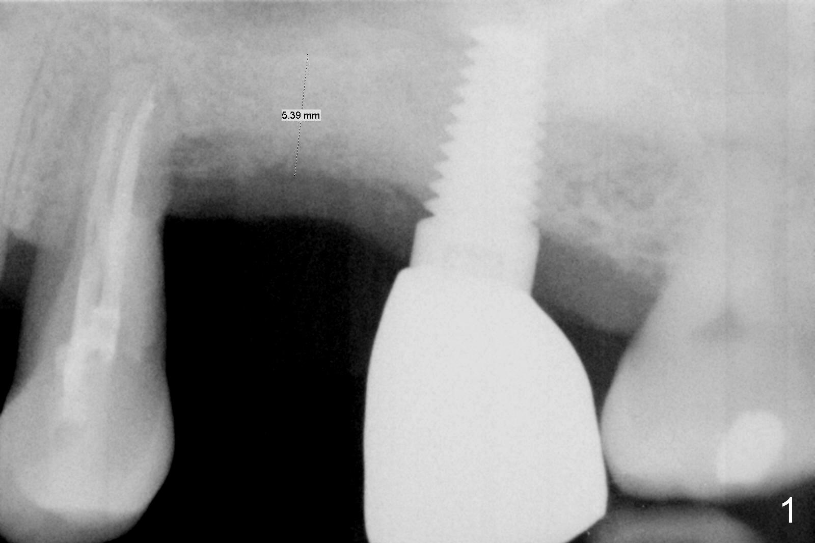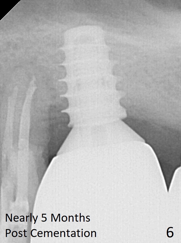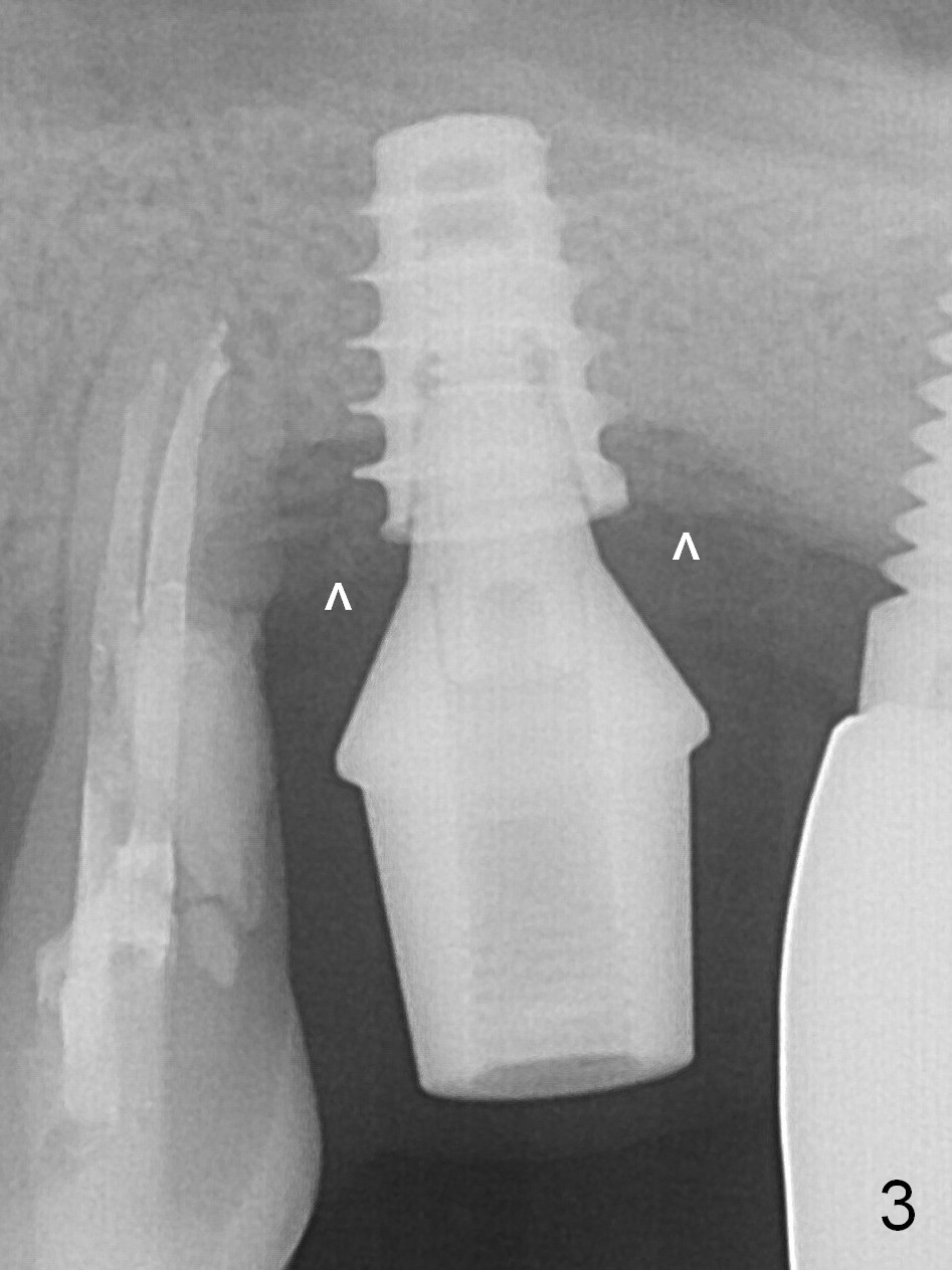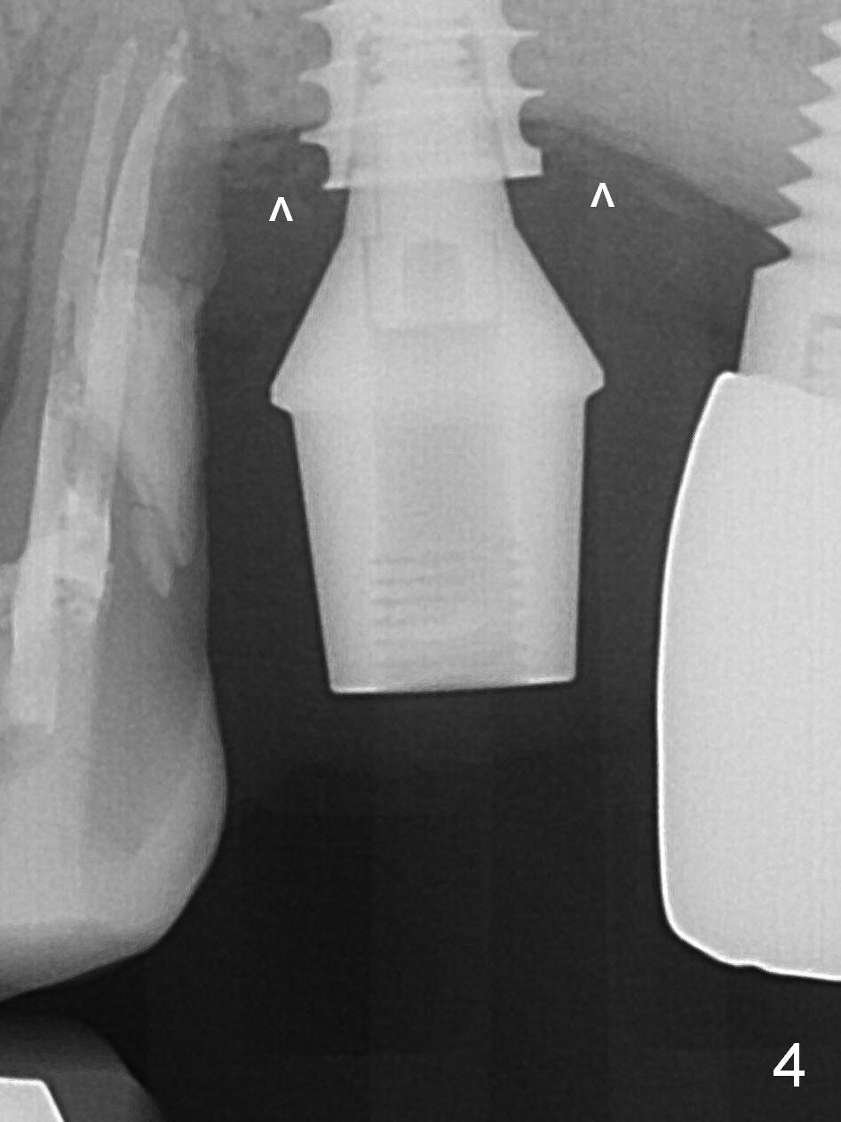 Four months post bone graft, the bone height at #14 is ~ 5 mm (Fig.1). After osteotomy for 4 mm with 4.3 mm Magic Drill (hard bone), Magic Sinus Lifter is used for sinus lift for ~ 8 mm without sinus membrane perforation. Perforation occurs with pulsating hemorrhage after sinus lift with allograft (.5-1 mm, mixed with Metronidazole). Collagen plug is used to repair the perforation before placing a short (5x7 mm) IBS implant with ~ 25 Ncm (Fig.2). After placing a 6.5x5.7(3) mm abutment, allograft is placed around the most coronal exposed implant thread (^). Acrylic is applied over the abutment for wound protection. There is mild nasal hemorrhage for 2 days postop. To prevent and treat sinus membrane perforation, PRF will be routine prepared preop for future cases. New bone forms apically and coronally 4.5 months postop (Fig.3,4 ^). A new temporary crown is fabricated so that it can undergo progressive loading for a few months before final impression. The definitive restoration is delivered 7.5 months postop (Fig.5). The bone density apical to the implant becomes apparently denser nearly 5 months post cementation (Fig.6). The bone density in the crest increases 2 years post cementation (Fig.7 *).