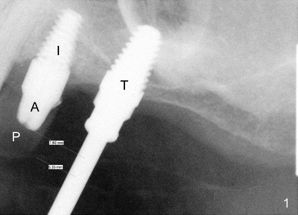 The position and trajectory of the osteotomy (Fig.1 T) and subsequently those of the implant (Fig.4: 14) are aided by a surgical stent, which is fabricated from the model (Fig.2).