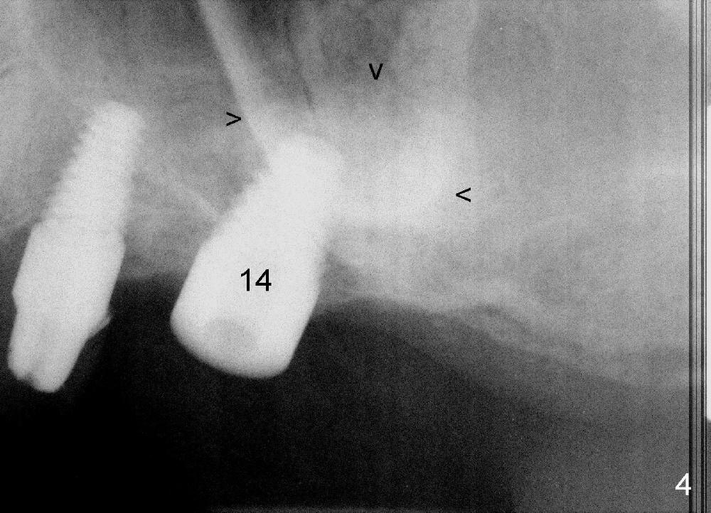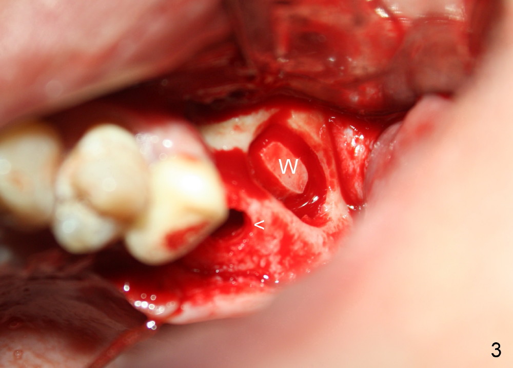 A lateral sinus window is created with a round diamond bur in high speed handpiece with copious irrigation as planned (Fig.3 W). The sinus membrane is lifted without tear. With the membrane protected with 2x2 gauze, an osteotomy (Fig.3 <) is developed at the site of the tooth #14 with 2 mm pilot drill, 2.5-3.5 mm reamers, 5x11 mm tap (Fig.1: T) and 6x11 mm tap. A synthetic bone graft (Osteogen 300-400 micron) is placed in the sinus before placement of 6x11 mm implant (Fig.4: 14). More of the synthetic bone mixed with autogenous bone is added superficial to the apex of the implant inside the sinus. The flaps are sutured.