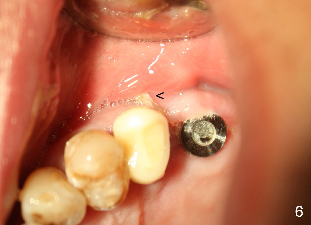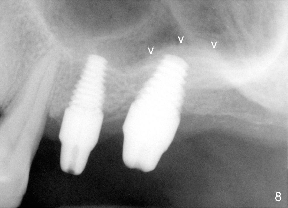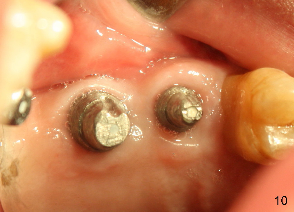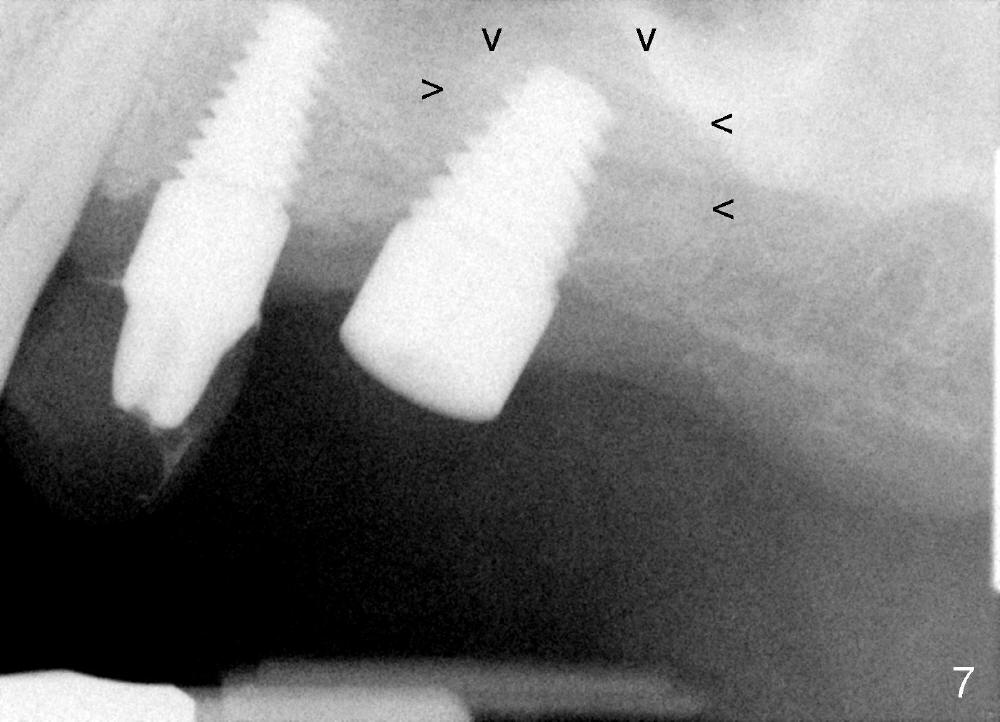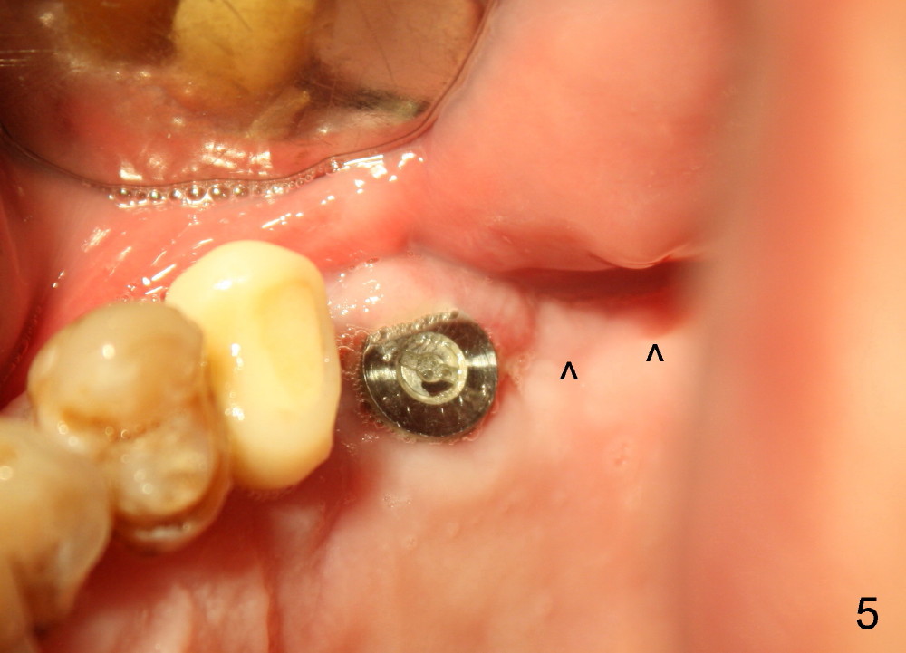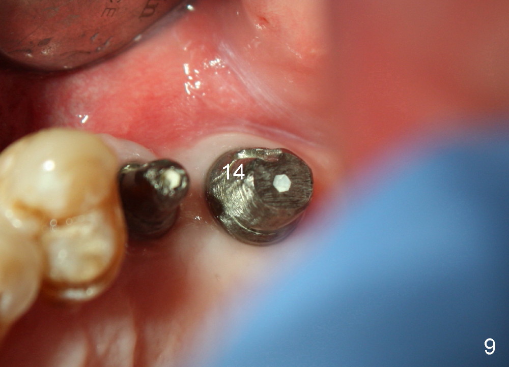 Bone graft remains in place 2 months postop (Fig.7 arrowheads); its density increses 4 months postop (Fig.8). The gingiva around the implant and abutment at the site of #14 is healthy (Fig.9 (4 months postop before final impression);10 (5 months postop immediately before final cementation)).
