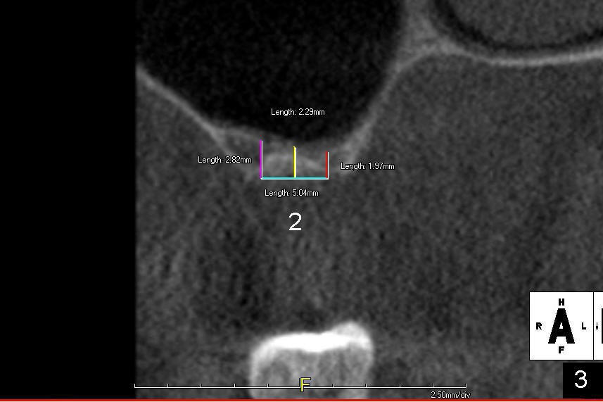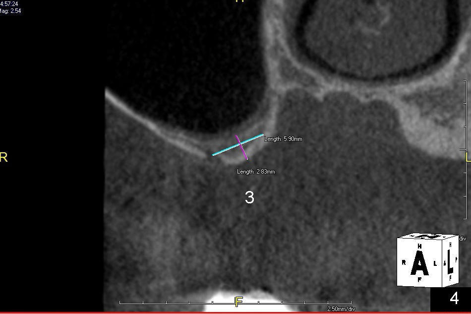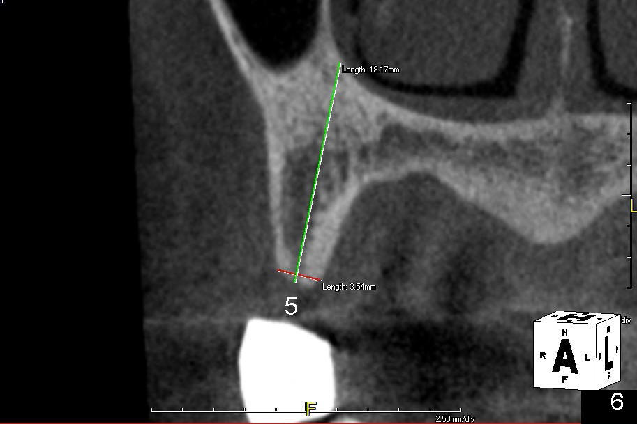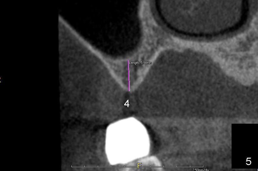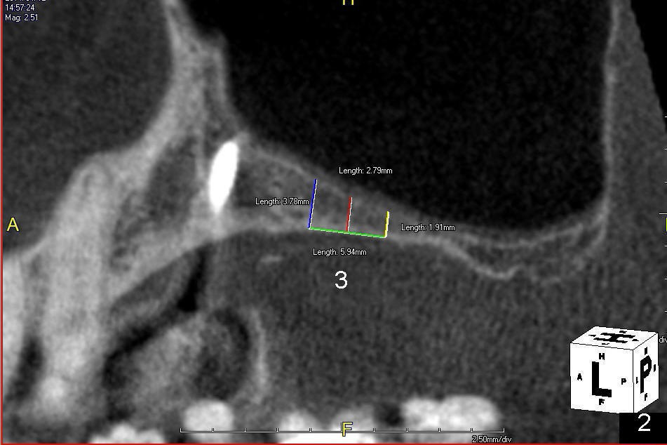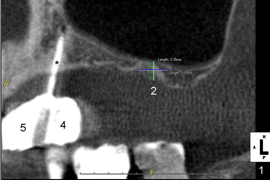 A 56-year-old lady lives out of state. She requests implant treatment for the upper right quadrants. Implants were removed by her previous care provider due to pain and infection. The premolars (Fig.1: #4,5) are provisionalized with a mini-implant (*). CBCT scans (Fig.1,2 (sagittal sections); Fig.3-6 (coronal section) show limited bone height involving the sites of the teeth #2 (Fig.1,3), 3 (Fig.2,4) and 4 (Fig.1,5). The buccolingual width is narrow at the sites of the teeth #4 and 5 (Fig.5,6).