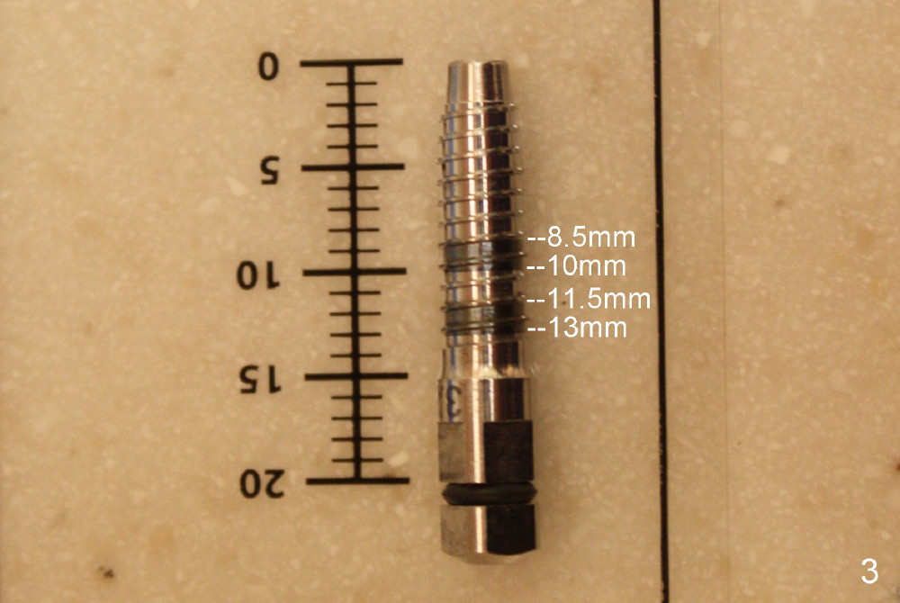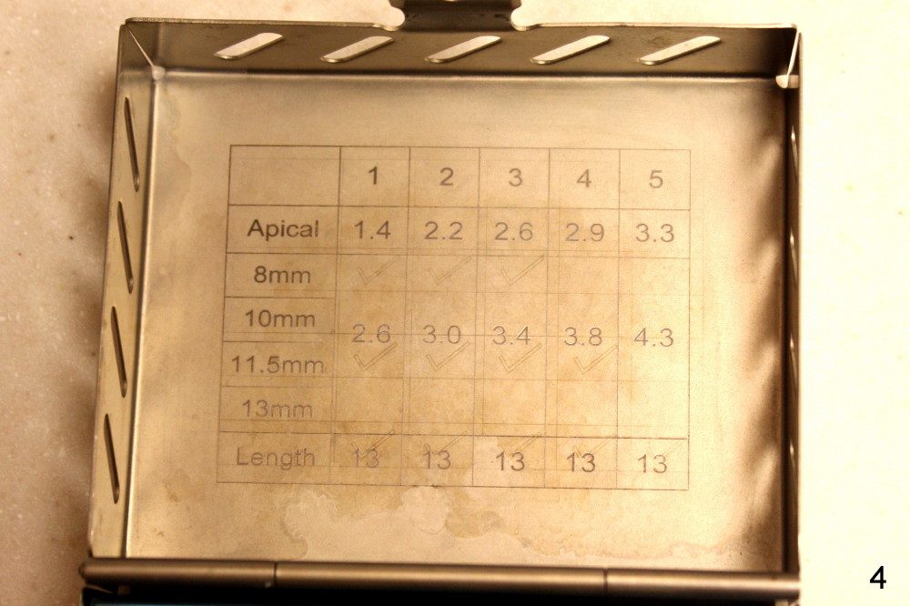 The apical end of each expander is flat and smooth, which is suitable for sinus lift (Fig.3). The first line of the first black band is 8.5 mm. The second line of the first black band is 10 mm. The first line of the second black line is 11.5 mm, while the second line of the second black band is 13 mm. It is important to know these marks to control the depth of bone expansion and sinus elevation.