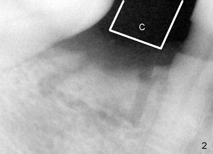 The phobic patient returns 5 weeks after the first surgery. Fig.1, 2 are taken in the first surgery. Fig.2 is used to show that the curved chisel (C) used for the 2nd surgery is wider than the superior bone cut. It appears that the buccal plate does not move when the chisel is applied.