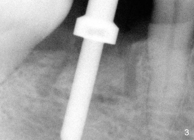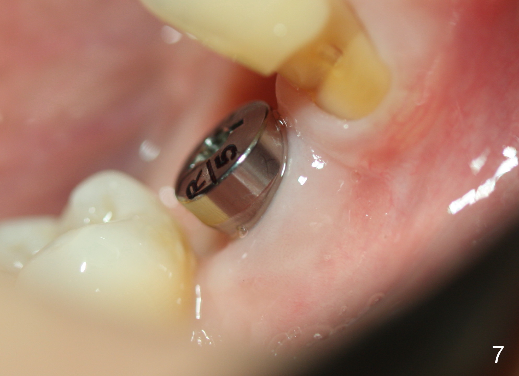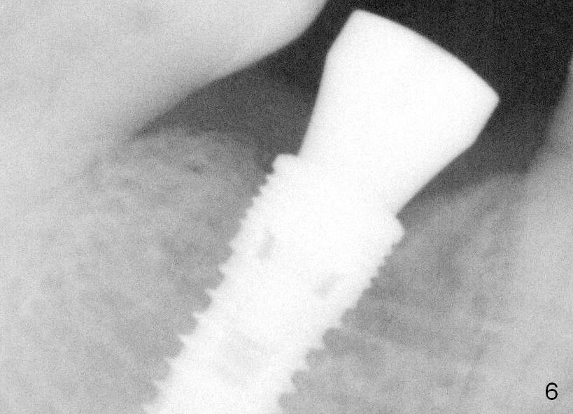 The patient returns less than 2 months postop. The bone sectioned areas are blurring (healing) (Fig.6). The soft tissue is healthy around the healing abutment (Fig.7).