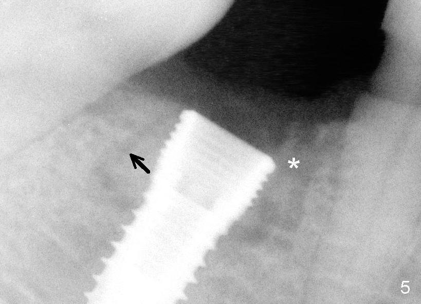 Since the bone feels not dense during osteotomy mentioned earlier, a 4.5x12 mm submerged implant is placed without further osteotomy (Fig.5). It looks like that the buccal plate moves distally (arrow, as compared to arrowheads in Fig.4). There is a bony defect mesially (*), where bone graft is placed later.