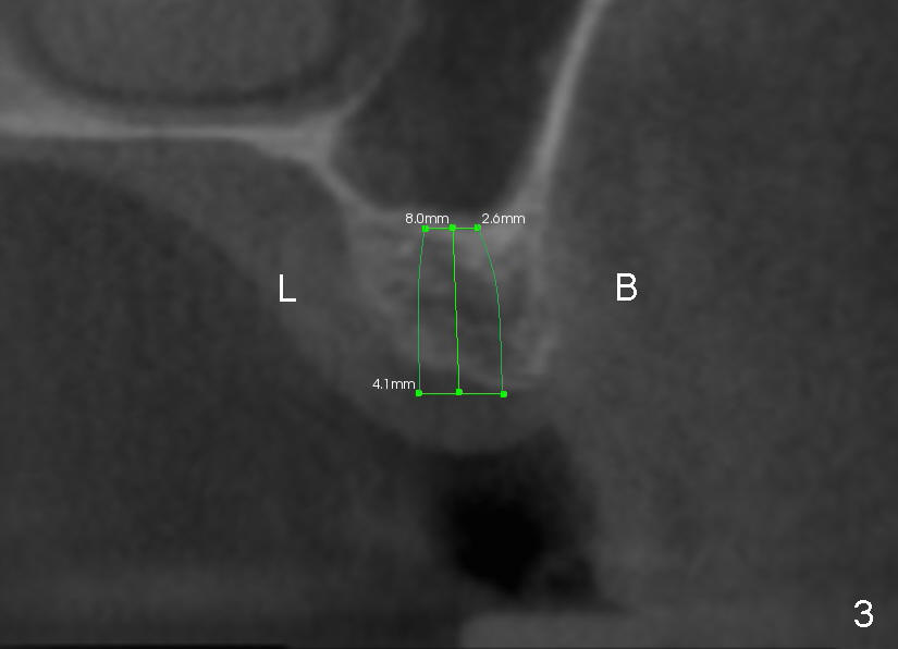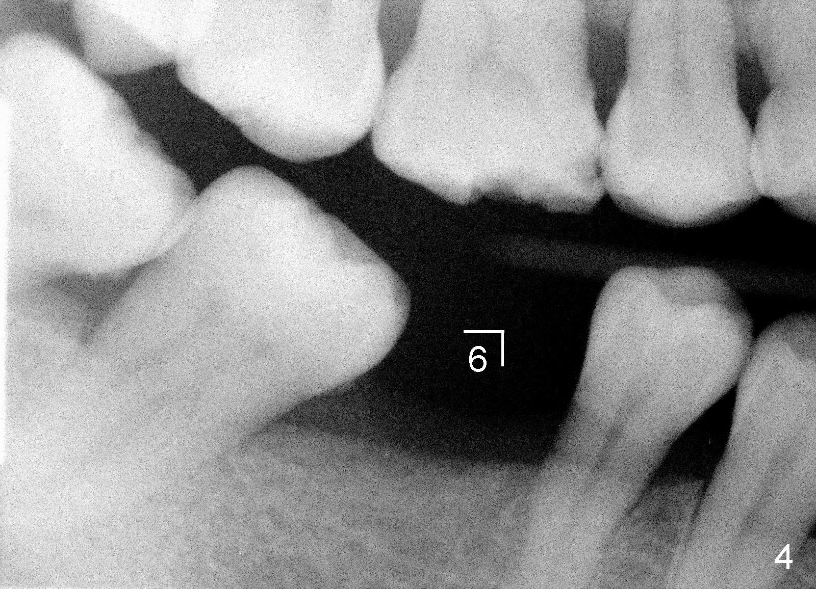A 44-year-old lady has lost two of the 1st molars (upper left (Fig.1-3) and lower right (Fig.4-6)) for several years. Fig.1,4 are preop PAs, Fig.2,5 CT sagittal sections, and Fig.3,6 CT coronal sections. The adjacent teeth shift and tilt into the edentulous space.