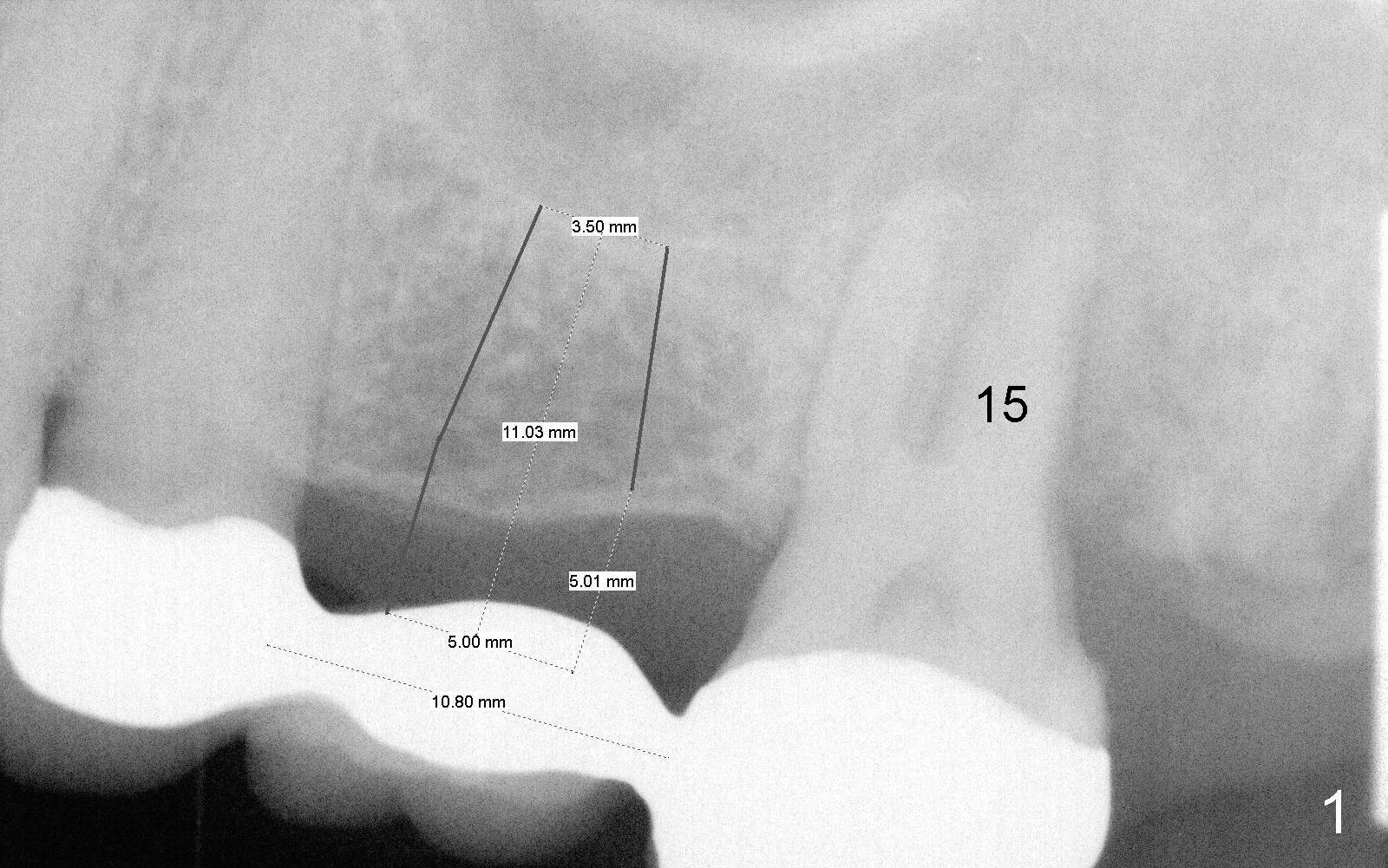 A 65-year-old lady has a failing FPD in the upper left quadrant (Fig.1). After the posterior abutment (#15) is extracted, an implant is planned at the site of #14 (5x11 mm). The bone width and density are expected to be low, considering the long term loss of the tooth.