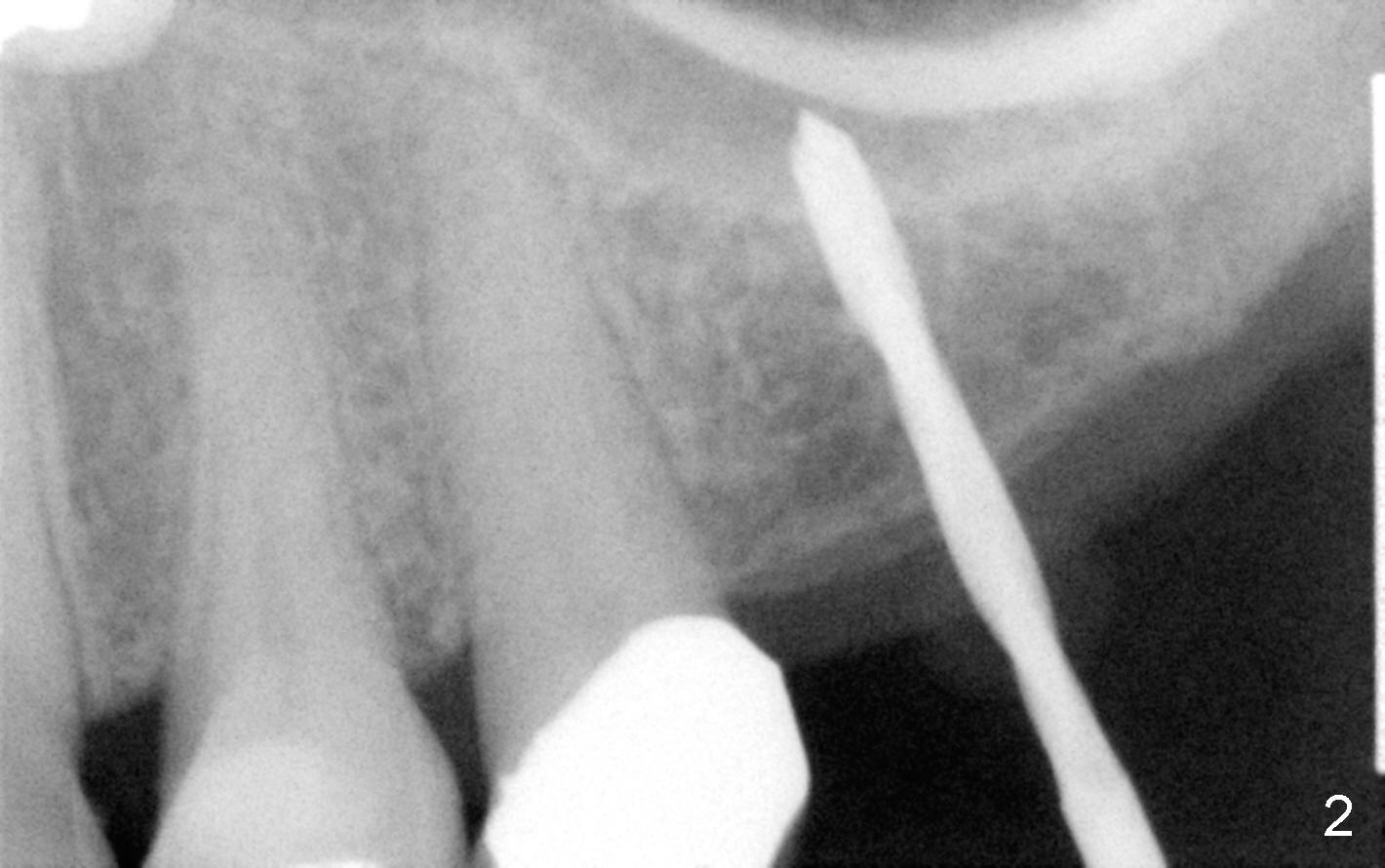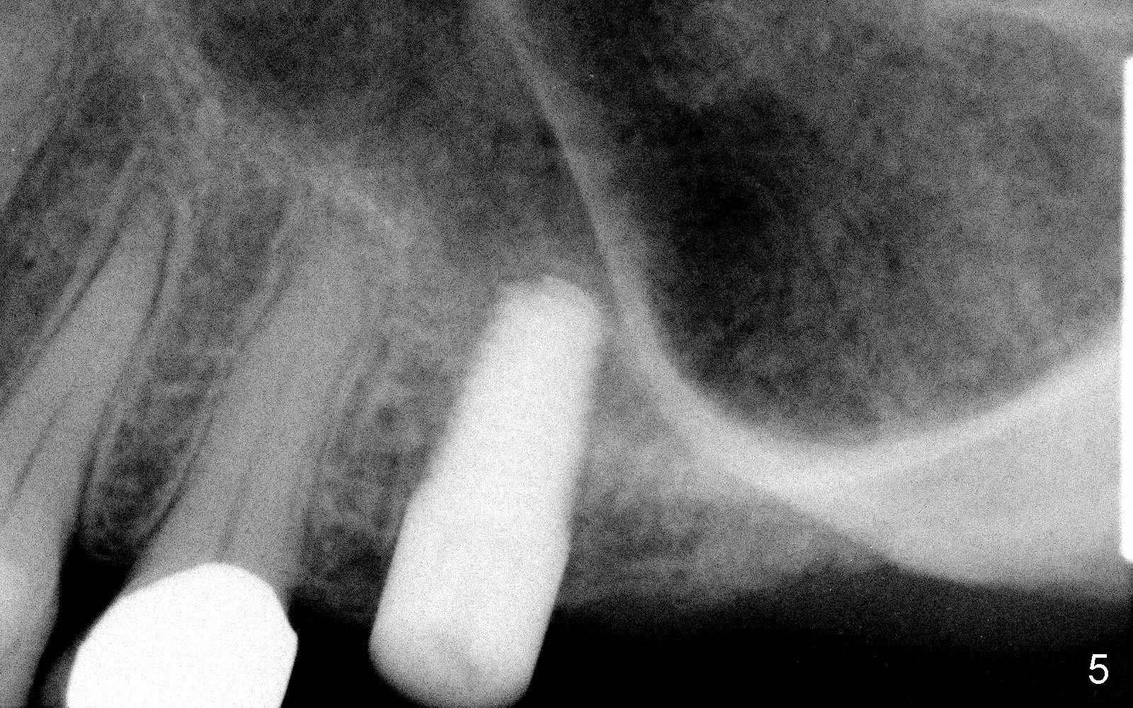 Fig.2 shows a 1.6 mm pilot drill at the depth of 11 mm; the tip of the drill penetrates the sinus floor. Bone expanders (2.6, 3.0, 3.4, 3.8 (Fig.3) and 4.3 mm) are used and alternated with tapered osteotomes (3 and 4 mm). The latter are used to break through the sinus floor. Then 4.5x14 mm and 5x14 mm taps are applied to create threads for implant. The second tap has some binding to the bone. Finally 5x14 mm tapered implant is inserted with more than 60 Ncm torque (Fig.4). Although the apical portion of implant (approximately 3 mm) pokes into the sinus, the patient does not experience nasal hemorrhage intra- or post-op.