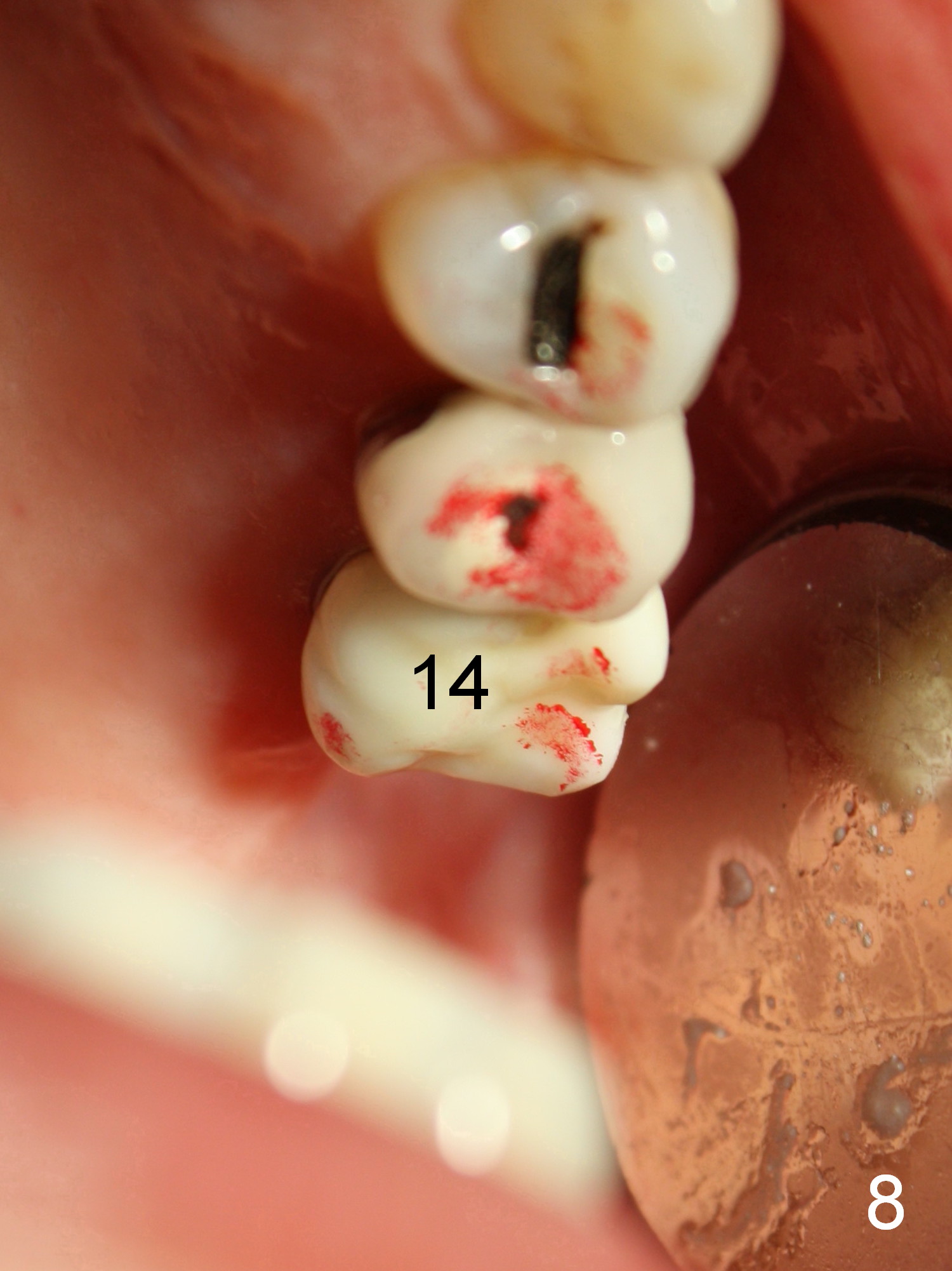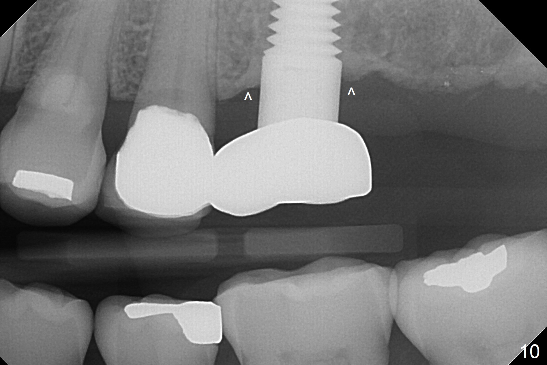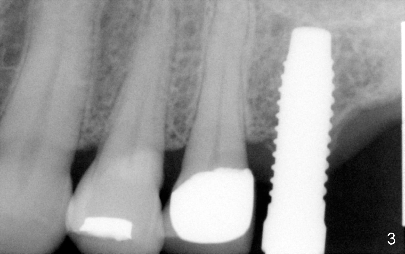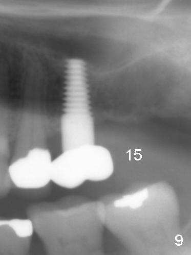 One year 2 months post cementation, the patient complains of inability to chew on the left. It appears that the crown at the site of #14 (Fig.8) is not as large as the tooth #3 (Fig.7); the occlusal contact of the crown is less than that of the tooth #3. The complaint remains the same after crown being remade. It appears that implant at #15 is needed (Fig.9: 1 year 9 months post cementation of #14 crown). The crestal cortical bone is thicker around the implant 2 years 4 months post cementation (Fig.10).