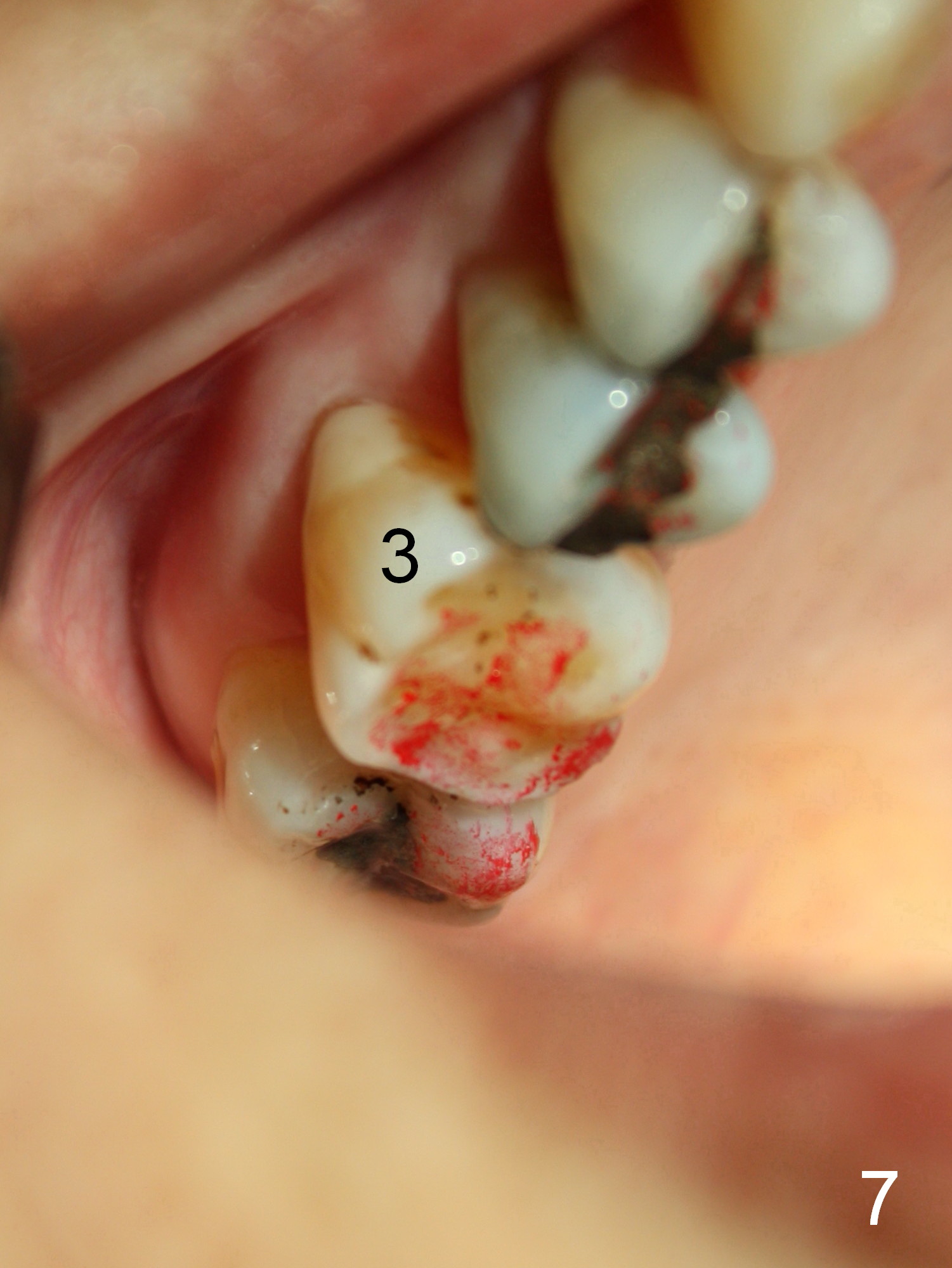 The patient develops herpetic infection on the left corner of the mouth and in the palate corresponding to the teeth #13 and 14. The infection disappears 7 days after antiviral mouth rinse and ointment.