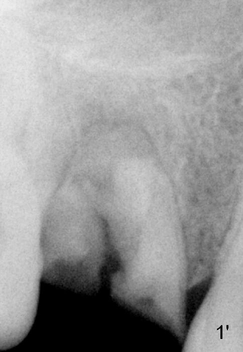 The bone density in the middle of the edentulous area is low (Fig.1 (PA taken immediately pre-implantation; 3.5 years post-extraction ), corresponding to the residual roots (Fig.1' (3 years prior to extraction). Bone expansion and condensation is necessary.