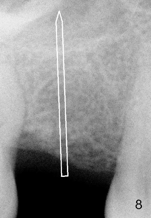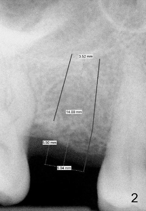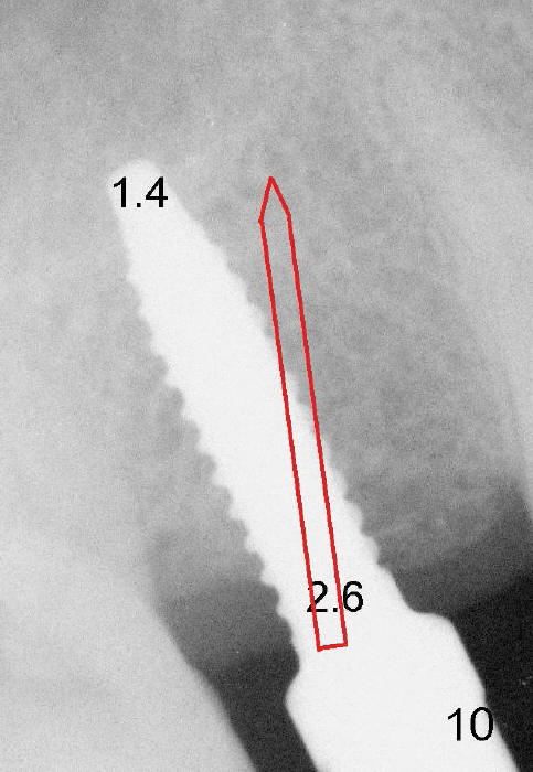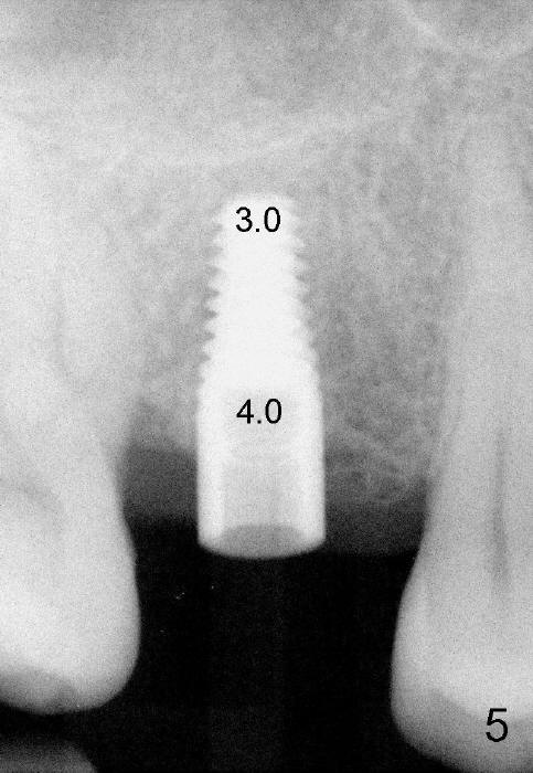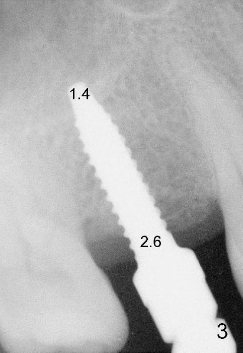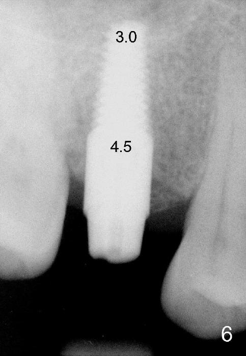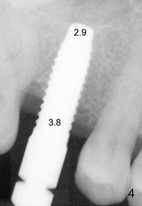 The 42-year-old lady is a dental phobic. The tooth #3 (residual root) is extracted 3.5 years ago. Finally she returns for implant (Fig.1). The mesiodistal space allows to place a 5x14 mm implant (Fig.2). Bone density is felt low when a 1.6 mm pilot drill is used. Bone condensation proceeds with bone expanders 2.6 mm (Fig.3) to 3.8 mm (Fig.4) 12 mm deep. Bone density is felt to increase with each larger expanders. When a 4x11 mm implant is placed (Fig.5), the insertion torque is 15 Ncm. When the diameter and length of the implant increase (Fig.6), the insertion torque is >60 Ncm. To have primary stability, the implant should be two sizes larger than the last expander (compare Fig.4,6)! In addition, the majority portion of the expanders is cylindrical (Fig.3,4), whereas the implant is tapered (Fig.5,6).