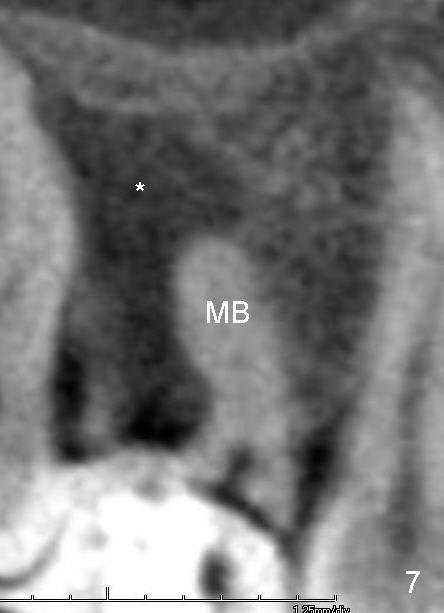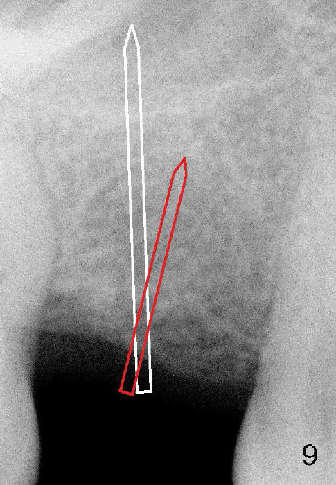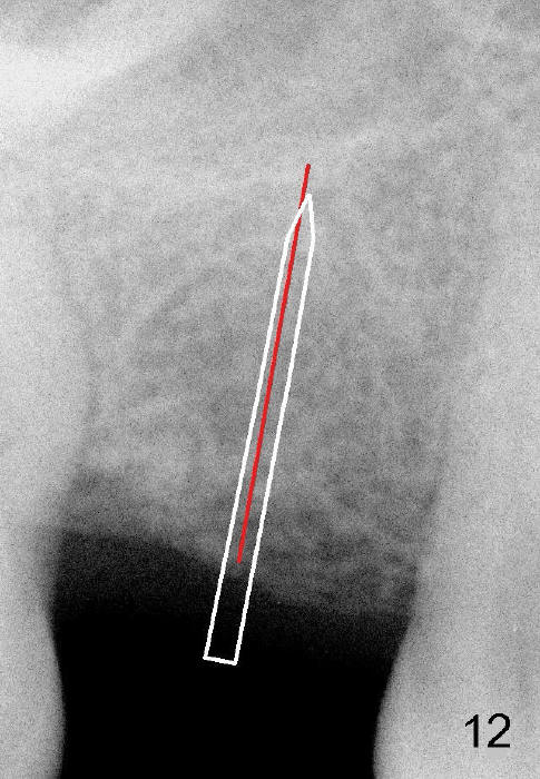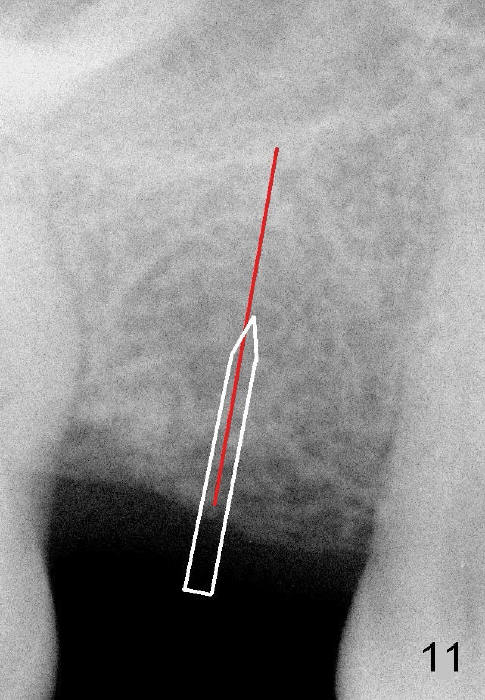 Another drawback of the implant placement is that the trajectory is off and distal (Fig.3-6), probably due to the low bone density in the distal aspect of the socket prior to extraction (Fig.7 CT sagittal section; MB: mesiobuccal root). The pilot drill must inadvertently have drifted distally and to the less dense bone (Fig.8). If it had been found, it could have been corrected early (Fig.9 red arrow). The trajectory could have been corrected immediately after the 2.6 mm expander (Fig.10). Ideally the pilot drill (Fig.11arrow) should be placed slightly mesial to the presumably mid edentulous line (red line) and only half of the length. If the trajectory is right, continue osteotomy (Fig.12). If not, correct it immediately.