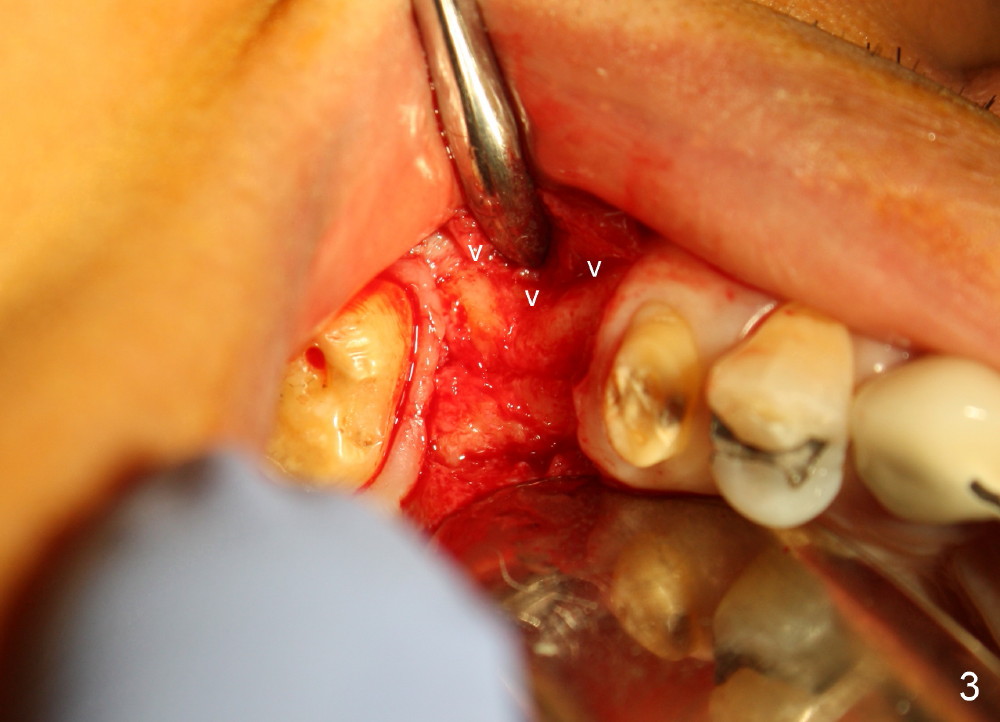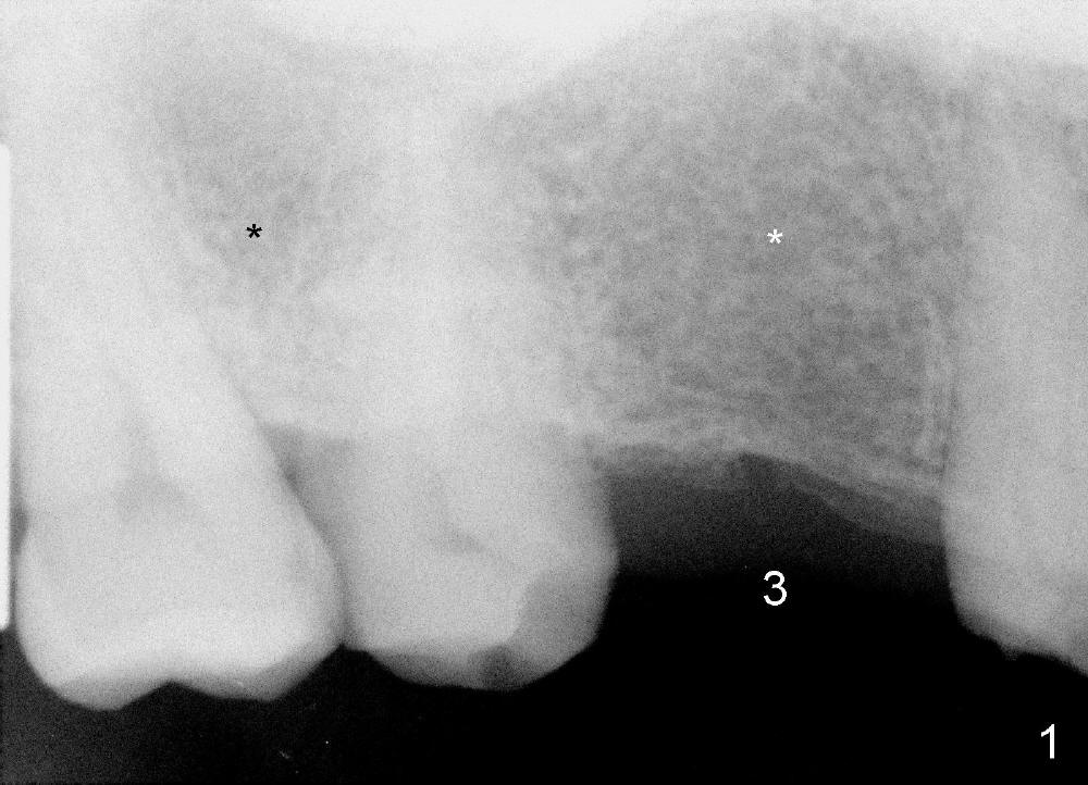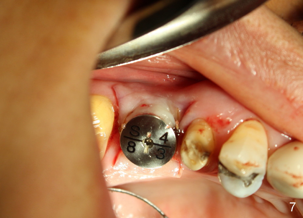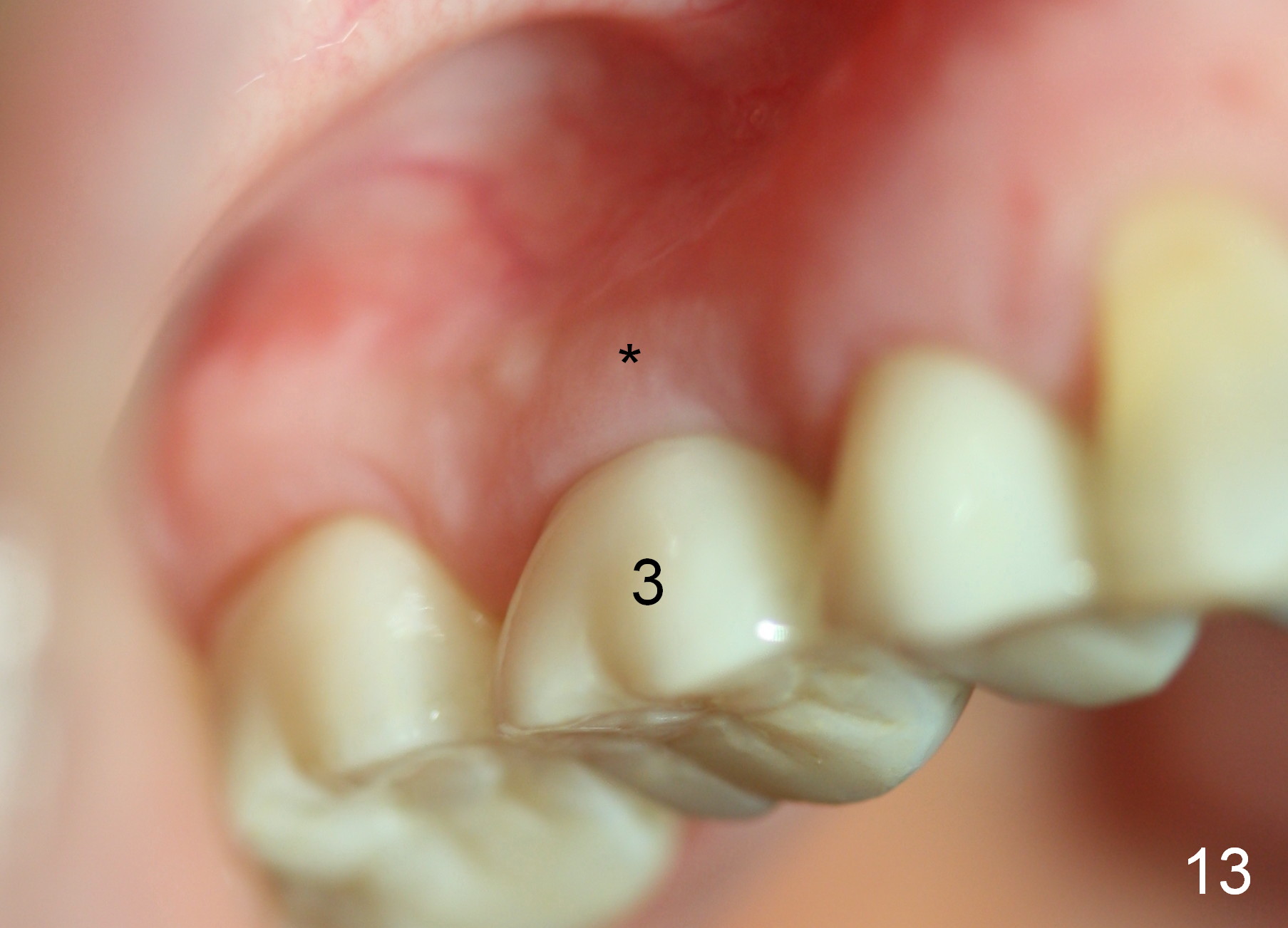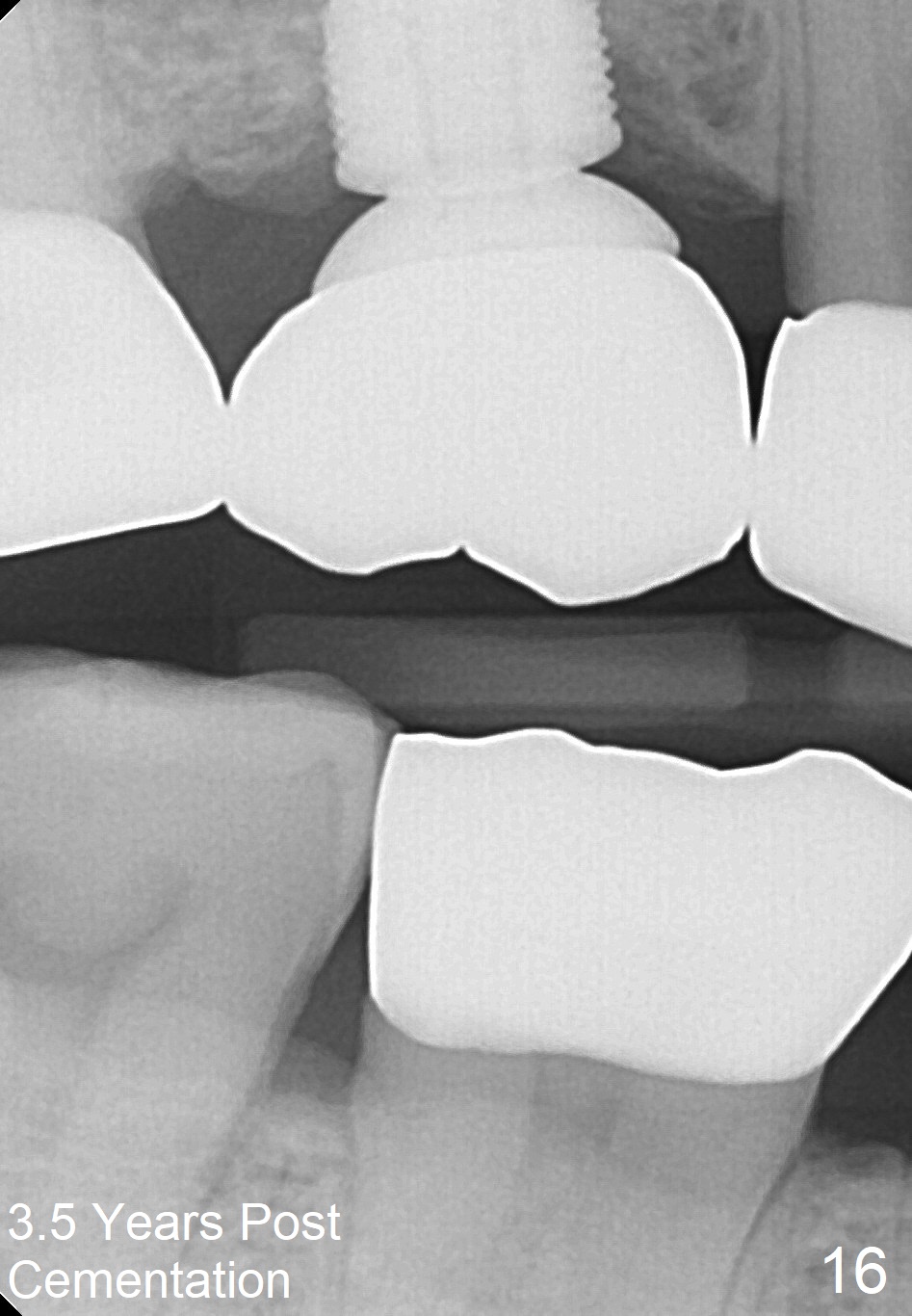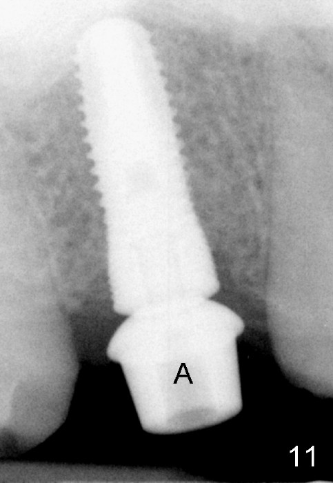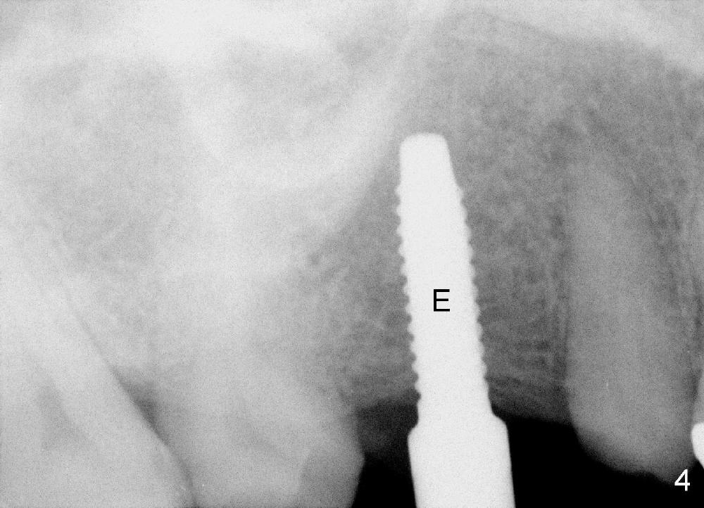 The bone density (Fig.1 white *) at the edentulous area (#3) is lower than that at the dentulous one (black *, 50 year-old man). The buccal plate is also atrophic and concave (Fig.2,3 arrowheads). A series of bone expanders are used to form osteotomy (following 1.6 mm pilot drill) at the depth of 14 mm (Fig.3 E 3.0 mm in diameter). When the last expander (4.3 mm) is removed from the osteotomy, the buccal plate appears to have been moved buccally (Fig.5 arrowheads). A 5.3x14 mm submerged implant (Fig.6 I) is placed with insertion torque >35 Ncm. The buccal plate seems to improve following placement of an 8.2 mm healing abutment and suturing (Fig.7). No bone graft is used. The buccal plate remains normal 12 days postop (Fig.8). It is slightly concave 3 months postop (Fig.9) with minimal bone resorption at the crest (Fig.10 (H: healing abutment),11 (A: cemented abutment). Nine months post cementation (12 months postop), bone resorption at the crest remains minimal (Fig.12) while the buccal plate (Fig.13 *) at #3 remains strong. Bone loss appears not to get worse 22 months post cementation (Fig.14). Soft and hard tissues remain healthy around the implant crown 3 years (Fig.15) and 3.5 years (Fig.16,17) post cementation.