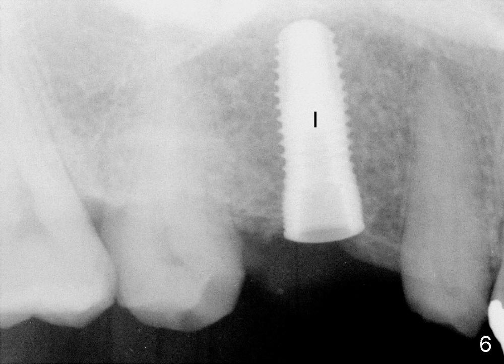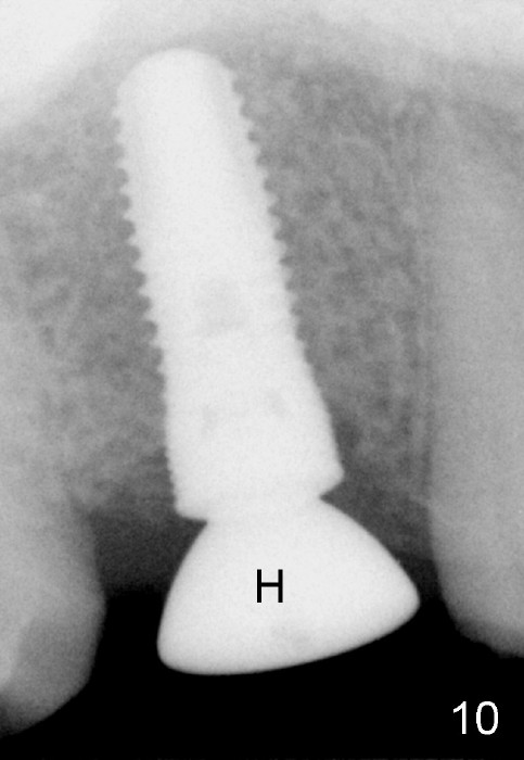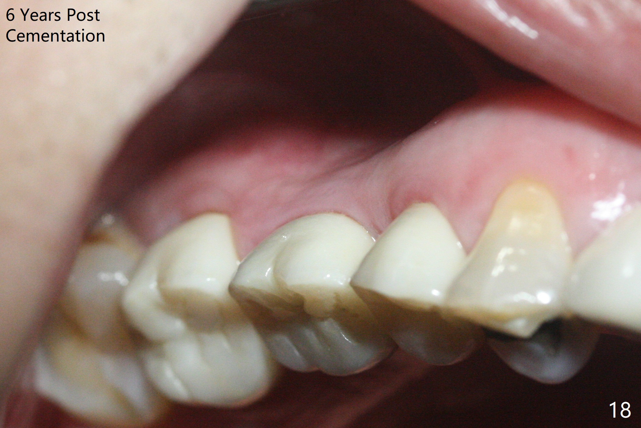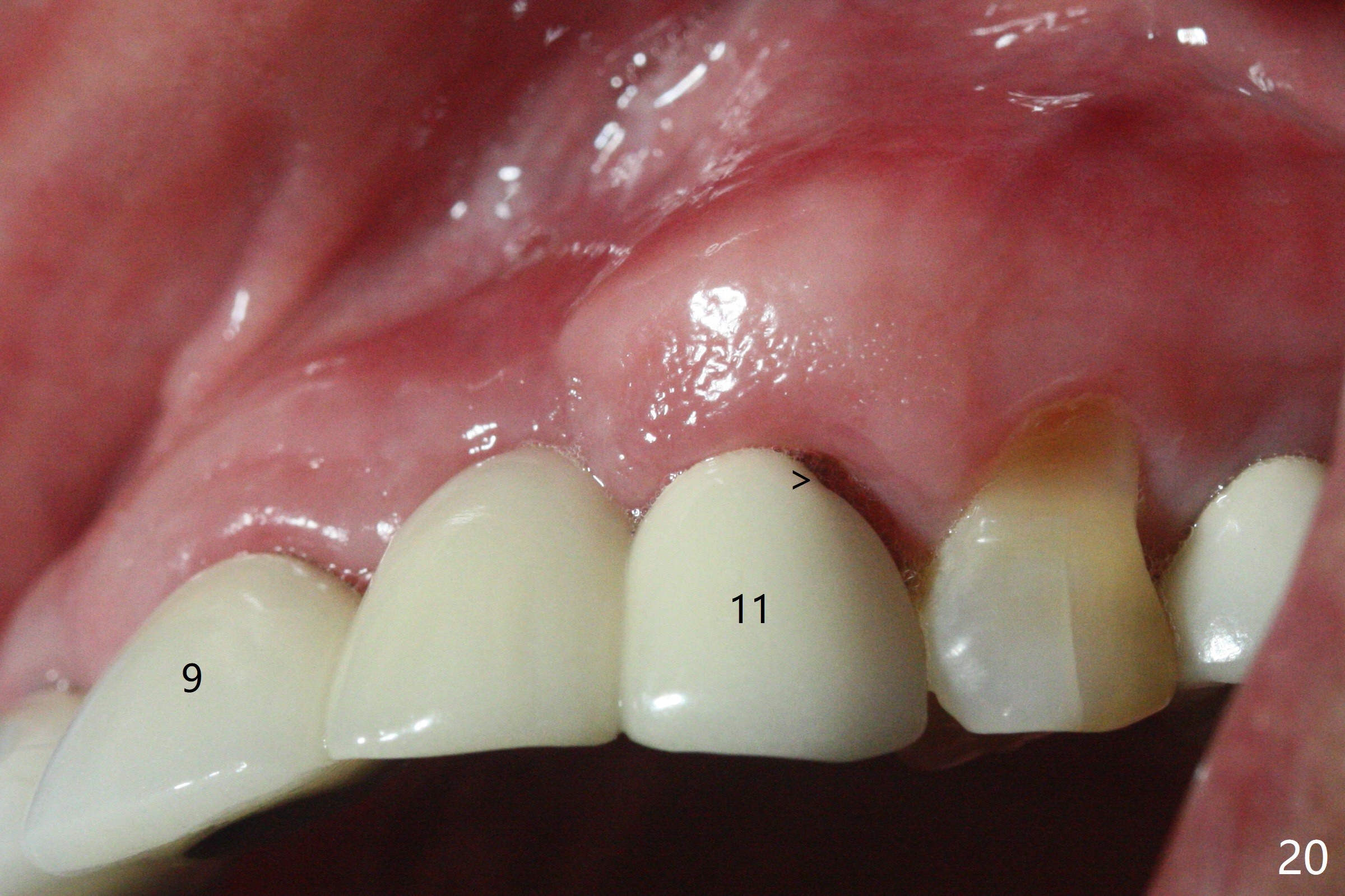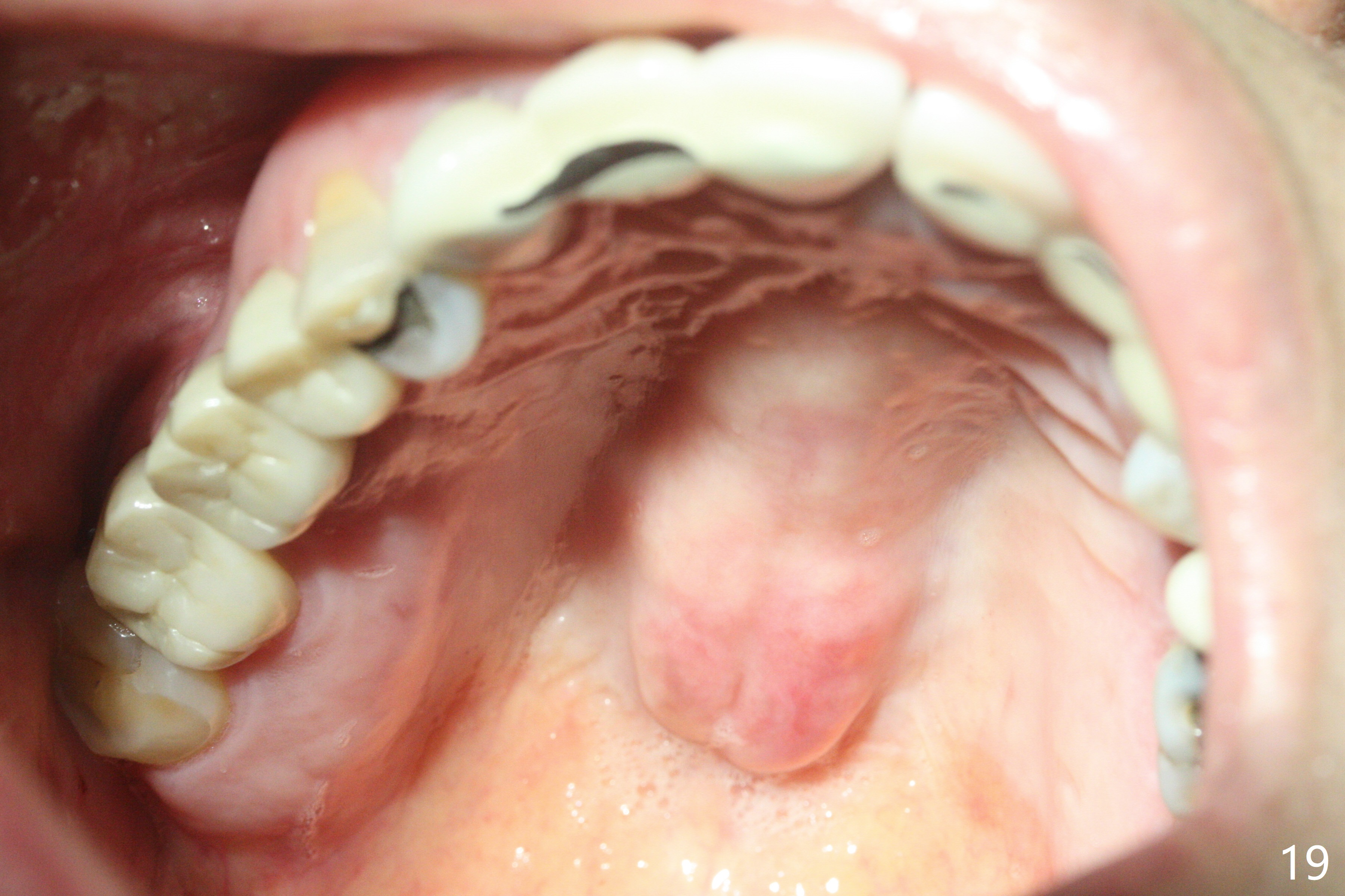 In brief, bone expanders or osteotomes can be used for bone expansion and condensation to improve primary stability of implant placement. No bone graft appears to be needed. The buccal concavity remains minimal 6 years post cementation (Fig.18). In fact he is a bruxer with torus palatinus (Fig.19). The bridge of #9-11 is loose because of subgingival fracture of the abutment of #11 for 2.5 years (Fig.20).