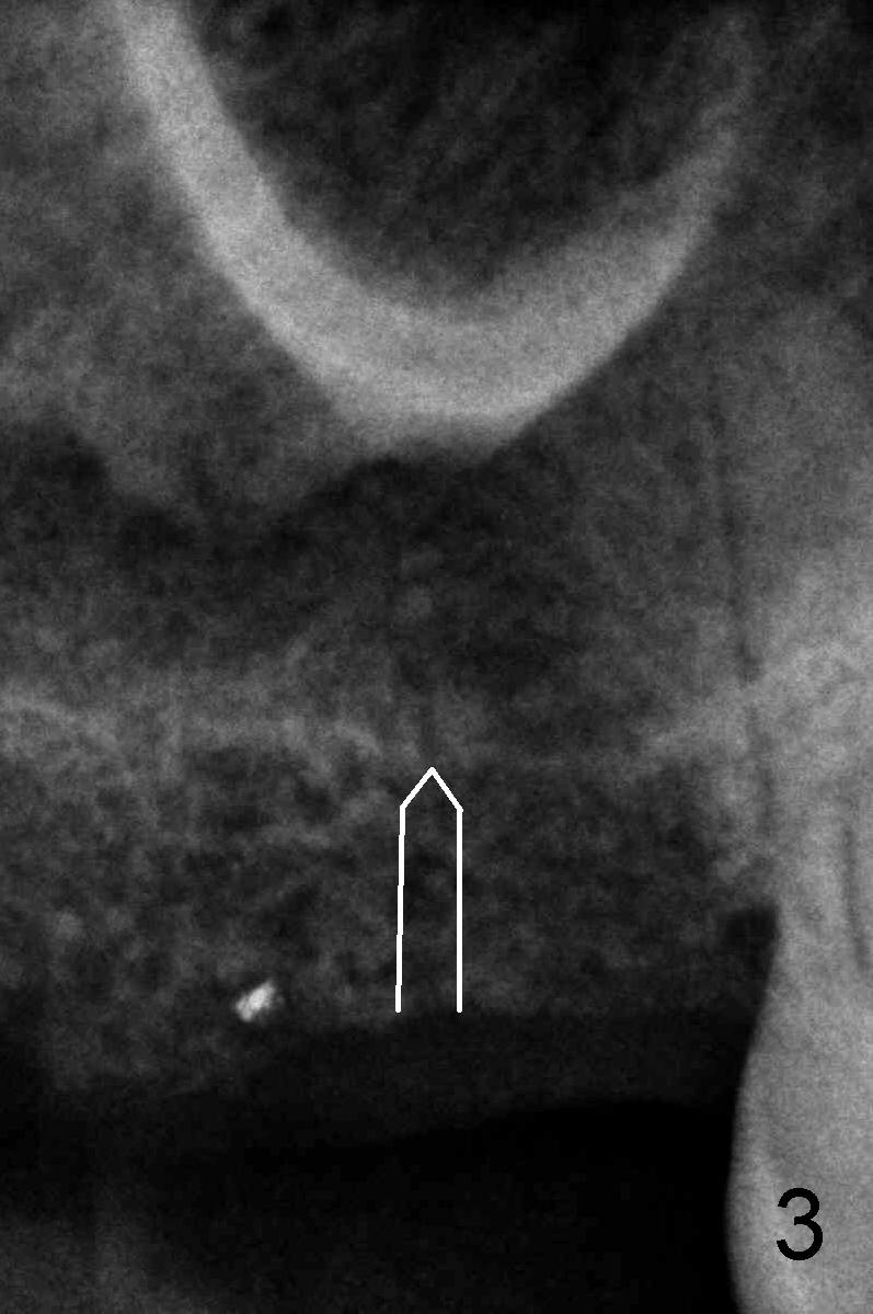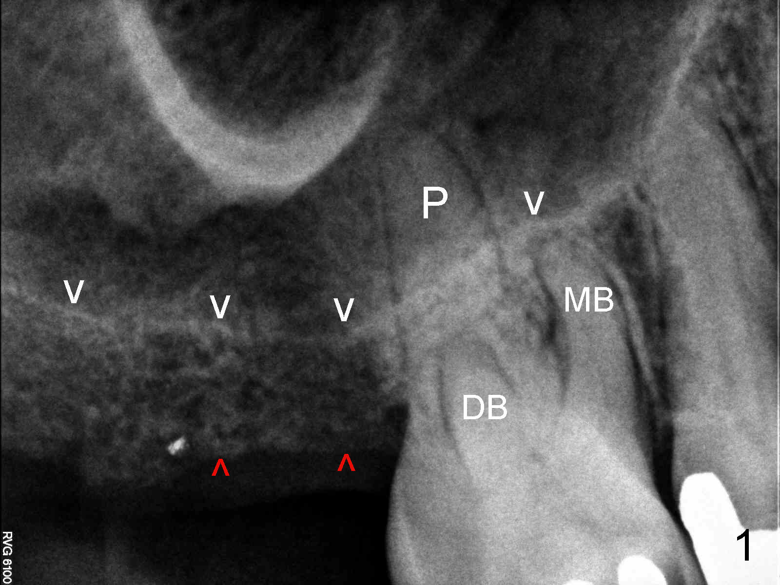 A 60-year-old man requests restoration of the missing upper right 2nd molar (Fig.1). It appears that the bone height is limited (between white and red arrowheads, approximately 5 mm (Fig.5)). Study of the sinus floor in association with the roots of the 1st molar reveals that the palatal root (P) appears inside the sinus. In fact it is not. Therefore there is bone apparently inside the sinus.