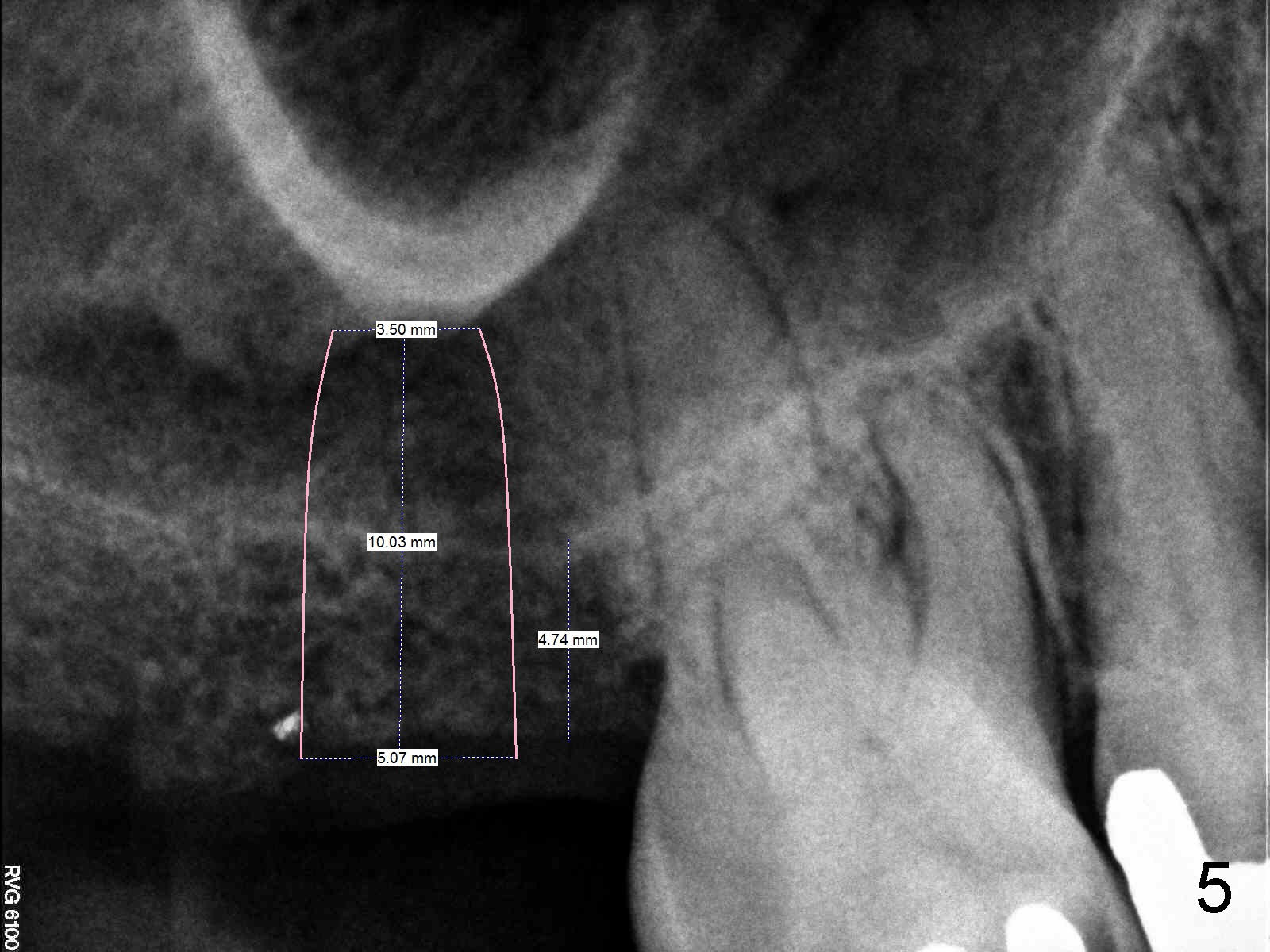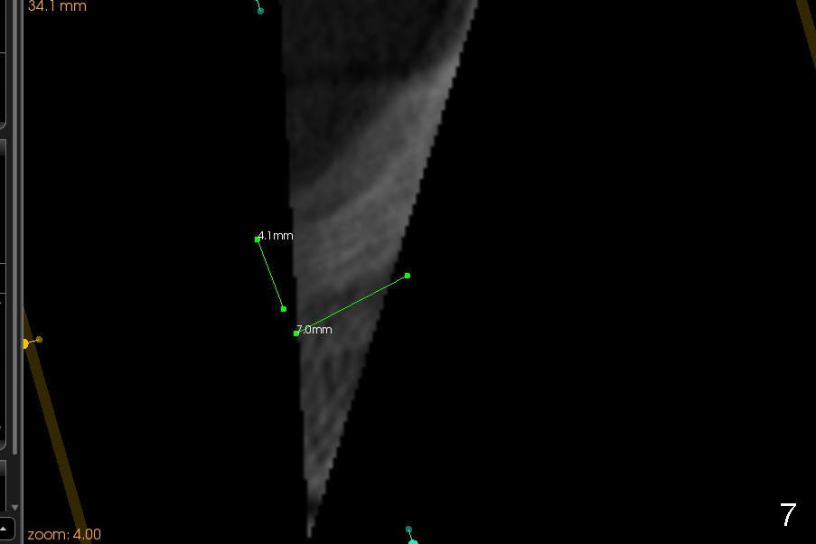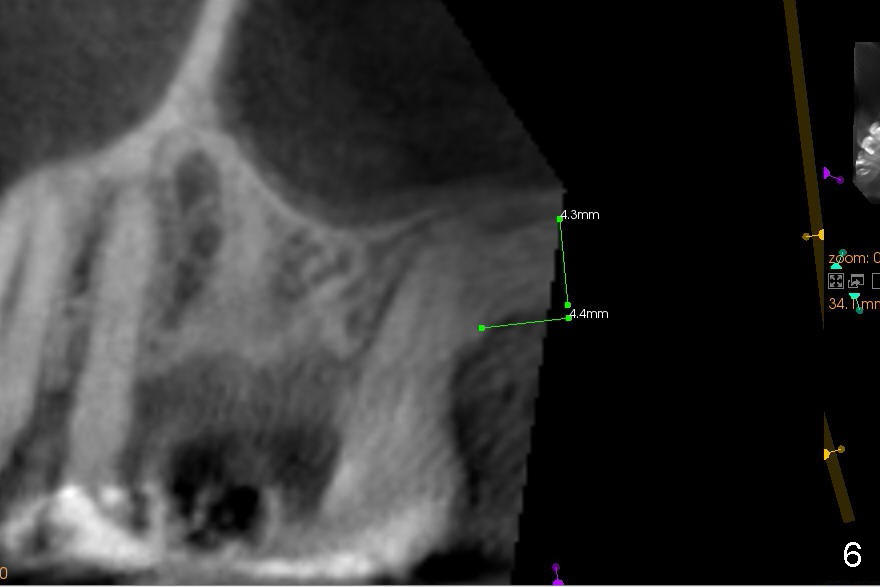CBCT confirms the bone height (4.4 mm) (Fig.6). Bone density is 200-400 Hounsfield units. The best new is sufficient bone width (7 mm) buccolingually.