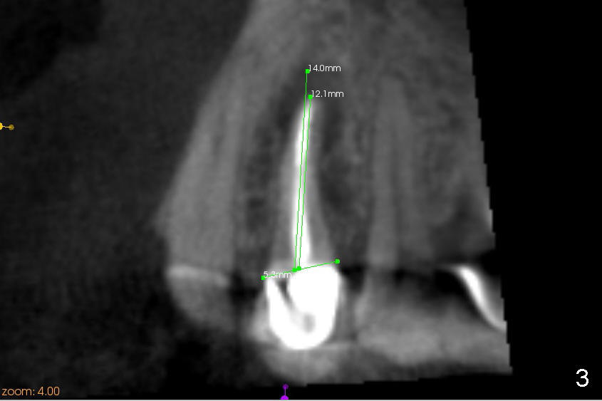 It appears that there is a buccal bony defect coronally. The implant is placed more or less palatally (in position and tilt) for better restoration. Either bone level (4.5x14 mm, Fig.1) or tissue-level (4.5x20, Fig.2) implant is placed. The diameter is more or less determined by the adjacent teeth (Fig.3). A 4.5x14 mm bone level implant should obtain sufficient primary stability (Fig.4). If not, either the diameter or length of the implant is to be increased.