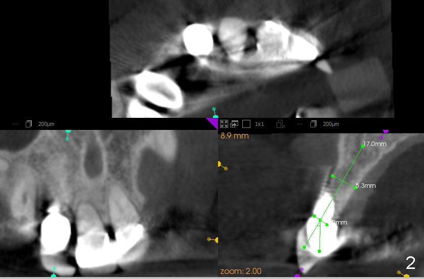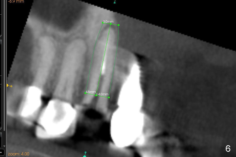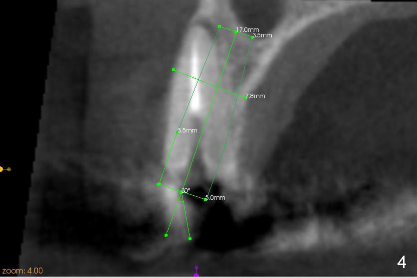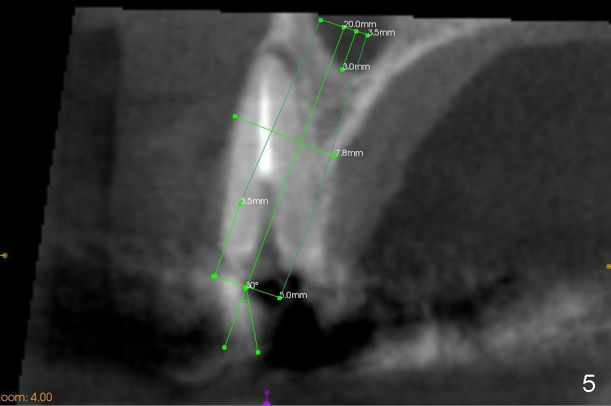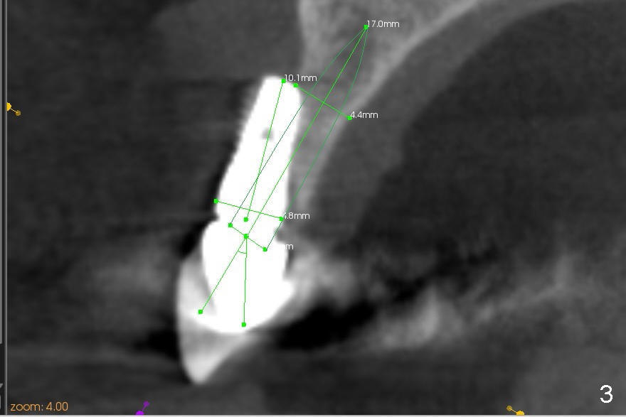 CBCT studies reveal that the implant perforates the buccal plate at the site of #7 and that there is still enough bone to support 3.0x17 mm one piece implant (Fig.2,3). There is limited bone apical to the tooth #6. The implant should be at least 17 mm for bone level and 14 mm for tissue level (Fig.4) or preferably 20 mm with sinus lift (Fig.5). The diameter will be 4.5 mm (Fig.6) or 5 mm (Fig.4.5).