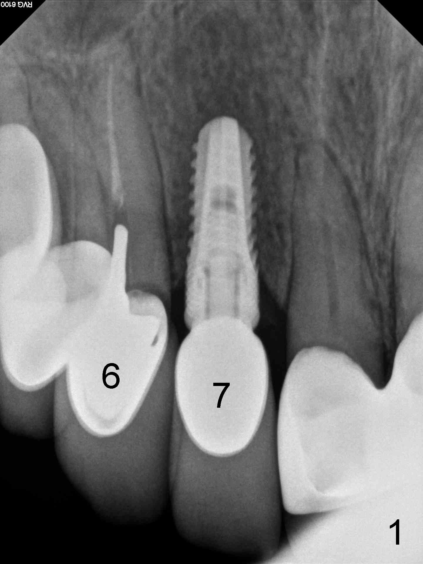 Robert: Thank for the info. The patient may be a bruxer. The implant at the site of #7 is probably too large for the bone. The buccal plate is most likely perforated. Do you have 3x20 or 23 angled one piece implant? If not, I will bring them. Immediate provisional for # 6 and 7 should be splinted. #7 may need cortical plate graft from the chin or ramus. This is the most interesting case. You must have crown forms in office.