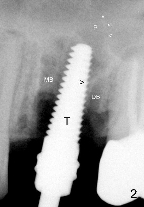 A 4.5x17 mm tap (Fig.2 T) is inserted 8 mm deep with binding to the septum. It appears that the sinus floor (black >) has been penetrated (in fact the septum height is ~5 mm), but the osteotomy has not reached the apex (white >) of the palatal (P) socket. Then the tap is advanced ~ another 3 mm. MB: mesiobuccal; DB: distobuccal socket.