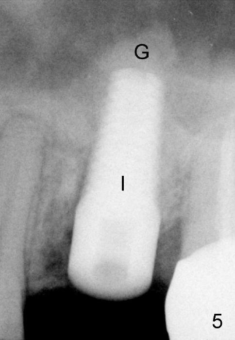 Mixture of autogenous bone from reamer, allograft and synthetic bone is placed in the mesiobuccal and palatal sockets before placement of the 6x17 mm implant (Fig.5 I). Unfortunately some of graft blocks the apical osteotomy. To clear the blockage, some of previous osteotome and taps are re-inserted. The result is in fact beneficial, as bone graft (G) is pushed upward.