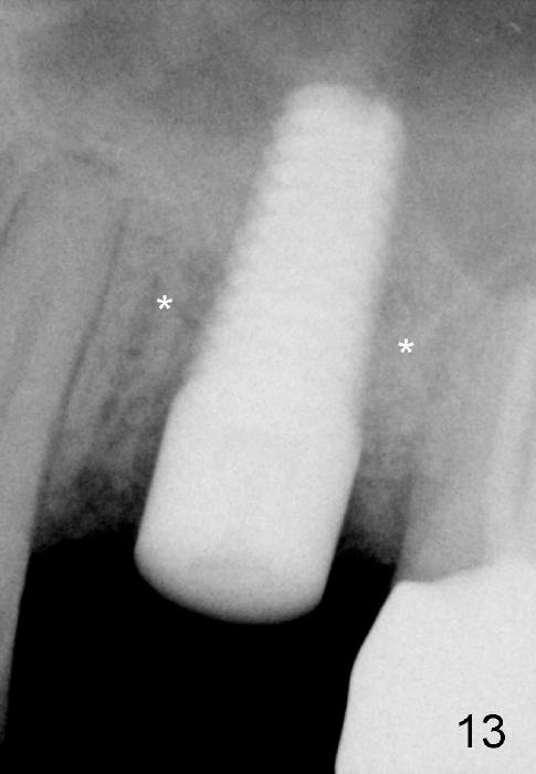 Four months postop, bone around the implant looks consolidated (Fig.13 *).