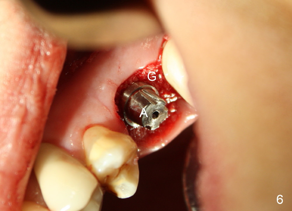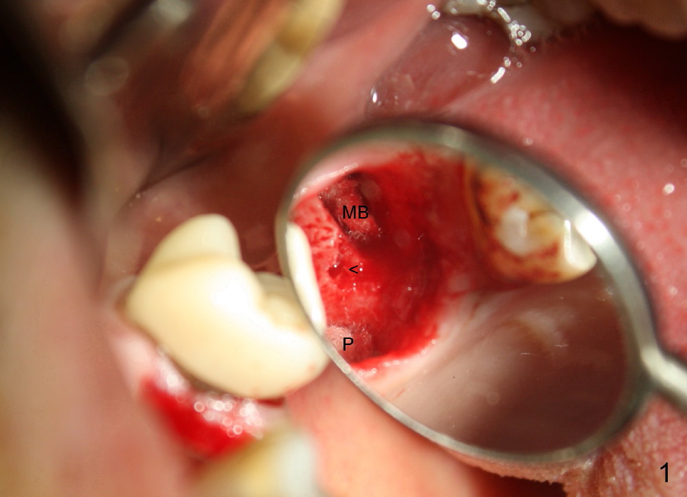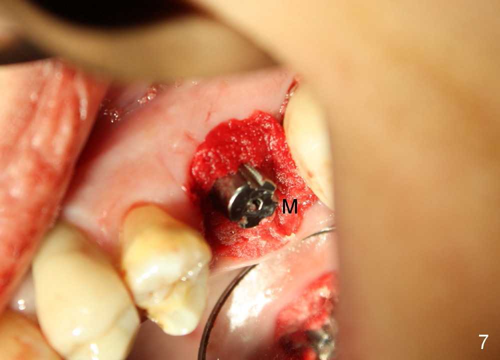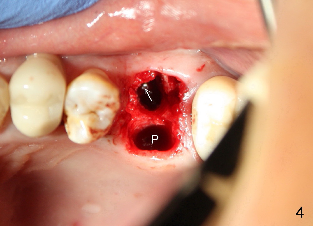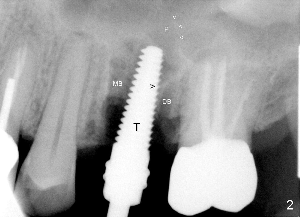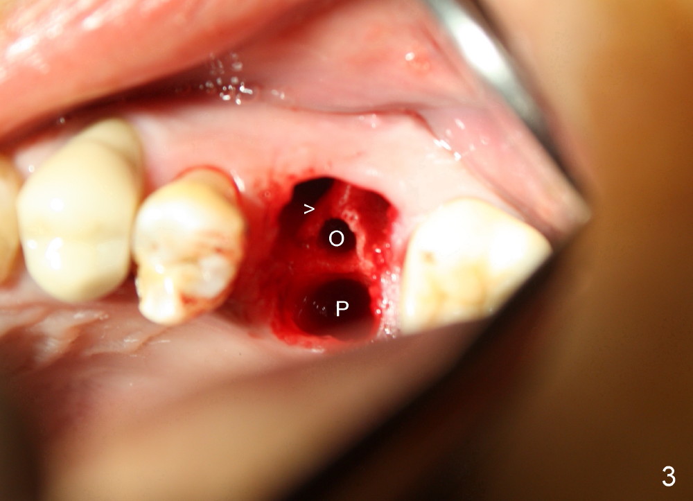 The upper left 1st molar is extracted with sectioning. The septum is large. A surgical fissure bur is used to initiate an osteotomy in the middle of the septum (Fig.1 <; P: palatal socket, MB: mesiobuccal socket), followed by tapping with resistance a 2 mm osteotome ~ 8 mm into the septum. It is tougher to drive 3 mm osteotomy. A 2.5 mm reamer is used to enlarge the osteotomy at 50 RPM at the same depth. Then it is relatively easy to tap 3 and 4 mm osteotomes at ~ 8 mm into the septum. A 4.5x17 mm tap is inserted 8 mm deep with binding to the septum. PA is taken (Fig.2). It appears that the sinus floor (black >) has been penetrated, but the osteotomy has not reached the apex (white >) of the palatal (P) socket. Then the tap is advanced ~ another 3 mm. When the tap is removed, the osteotomy (Fig.3 O) is slightly toward the buccal aspect of the extraction socket, but it has intact wall, including the mesiobuccal (>). The apex of the ostoetomy has no bone, but there is no air leakage. The next tap, 5x17 mm, is inserted shallower (~ 8 mm in the septum; to reduce potential trauma) with stability. However, 6x17 mm tap at the same depth does not obtain stability, since the osteotomy deviates severely mesiobuccally (Fig.4 arrow) with breakdown of the mesiobuccal wall. So the osteotomy has to be deeper in order to achieve stability of 6x17 mm tap (by engaging into more apical bone). A 7x17 mm tap is then intended to be inserted to close the socket as much as possible, but as it is being inserted, the osteotomy is more severely deviated and tilted mesiobuccally with the original mesiobuccal wall further being broken down (not shown). It appears to compromise stability. Mixture of autogenous bone from reamer, allograft and synthetic bone is placed in the mesiobuccal and palatal sockets before placement of the 6x17 mm implant (Fig.5 I). Unfortunately some of graft blocks the apical osteotomy. To clear the blockage, some of previous osteotome and taps are re-inserted. The result is in fact beneficial, as bone graft (G) is pushed upward. Prior to implant placement, nose blowing test does not produce air leakage. More allograft is placed in the coronal portion of the sockets (Fig.6 G); an abutment with precut slots is placed (A) with intention of better holding perio dressing in place after placement of a collagen dressing (Fig.7 M). A temporary crown may be placed when the perio dressing is dislodged. The provisional is to keep the membrane and bone graft in place. The patient returns for follow up 1 week postop. He is symptom free. The abscess appears to be resolving (Fig.8 >); the perio dressing remains in place.