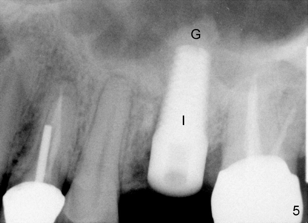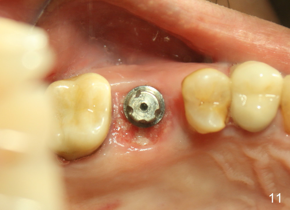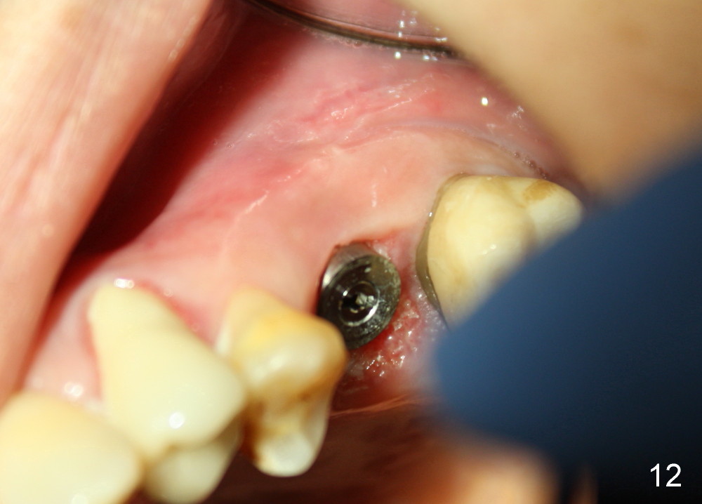 The 2nd perio dressing lasts for another two weeks. When it is removed in clinic, the wound heals; the implant is shown placed slightly buccally (Fig.11, occlusal mirror image). Buccal view shows that the fistula dissolves (Fig.12).
