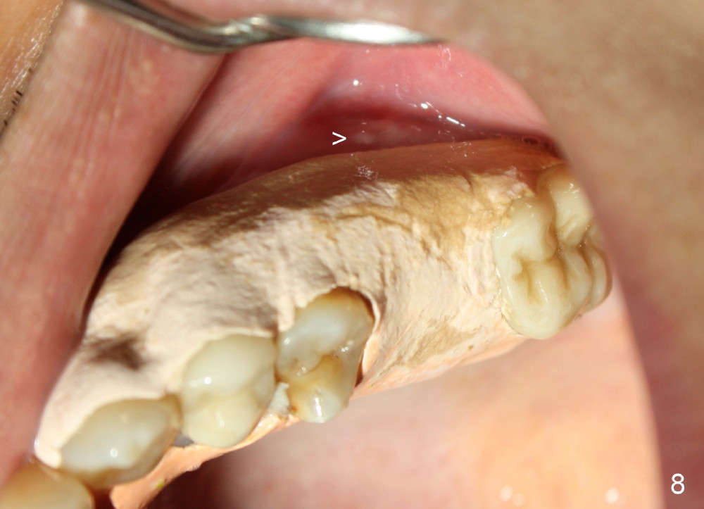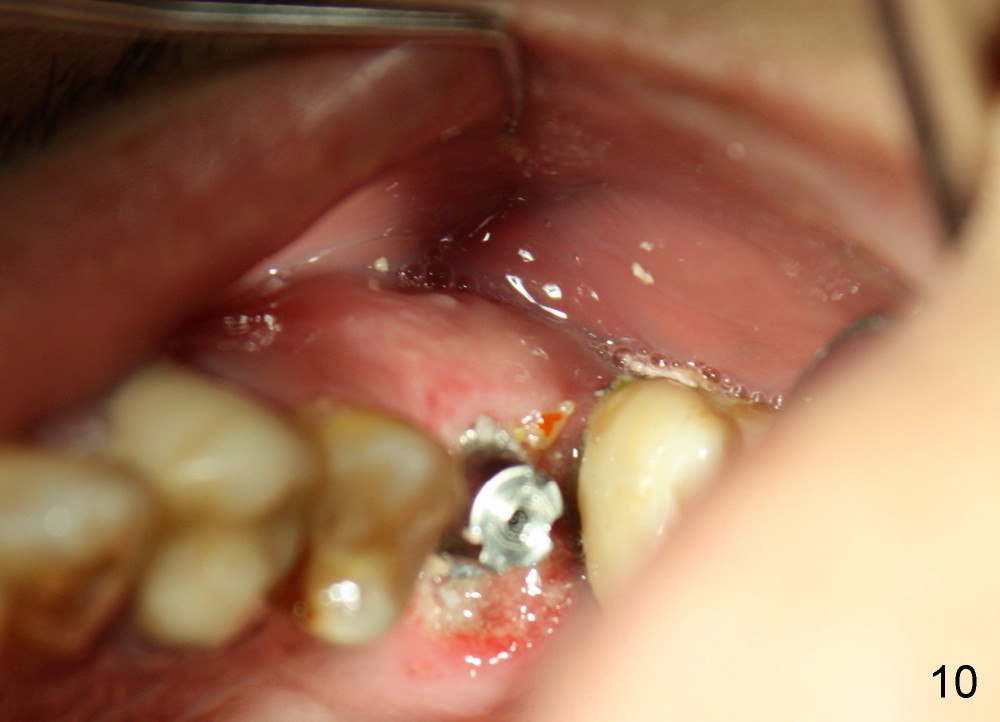 One week later, the lingual portion of the perio dressing is dislodged. The wound is healing, while part of bone graft is exposed (Fig.9 ^). The remaining perio dressing is removed before repacking (Fig.10): it appears that the buccal fistula has disappeared, as compared to preop.