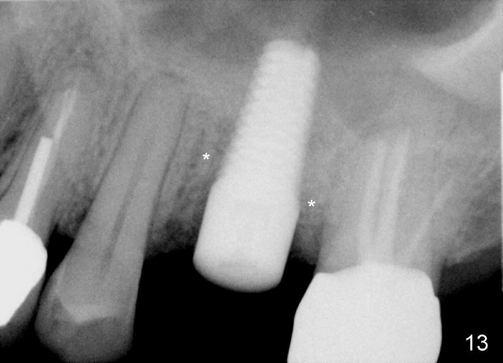Four months postop, bone around the implant looks consolidated (Fig.13 *, compare to Fig.2,5).