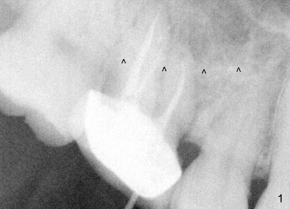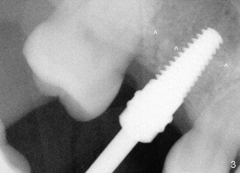 The tooth #3 of a 45-year-old man has endo failure (Fig.1), which shows that the sinus floor (^) is lower than the root tips. Fig.2 is taken a few days post extraction. Note low bone density in the socket, which is the basis for bone condensation. Five months later the patient returns for implantation. A ~12 mm incision is place in the edentulous ridge. The osteotomy forms by using osteotomes (rounded tapered 2-4 mm), followed by insertion of a 4.5x14 mm tap at the depth of 11 mm (Fig.3). It appears that the tip of the tap is in the sinus, but the top of the osteotomy has solid bone when the tap is removed. The bone is being expanded until 7x14 mm tap at the depth of 11 mm (Fig.4). The roof of the osteotomy is still intact. It appears that bone expansion intentionally lifts the sinus floor.