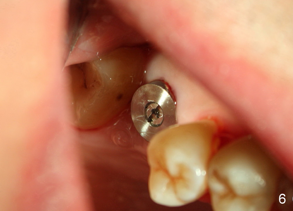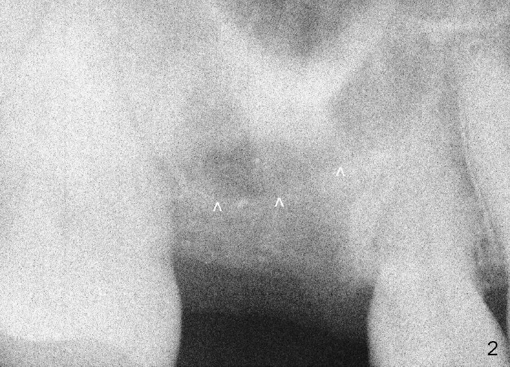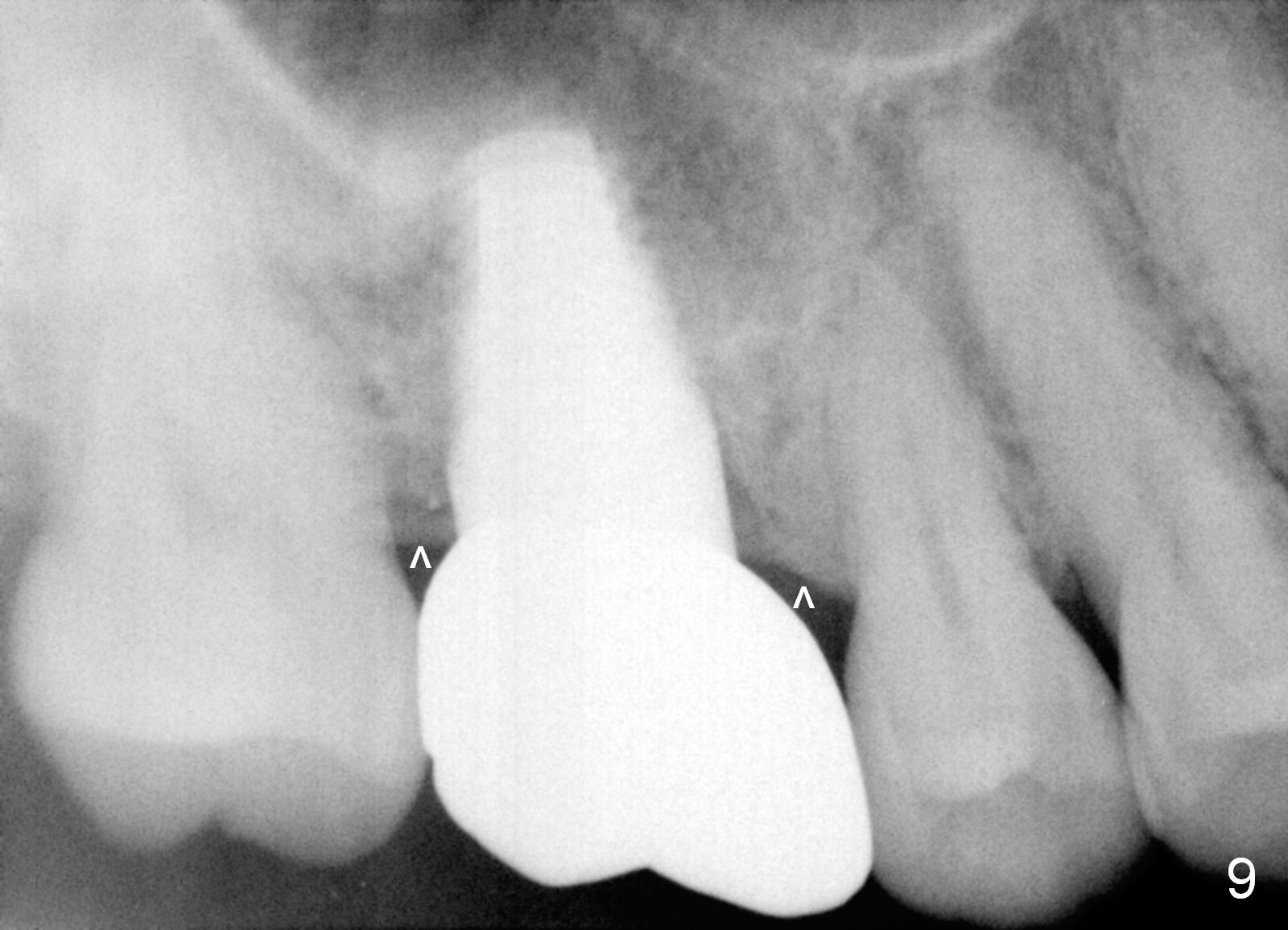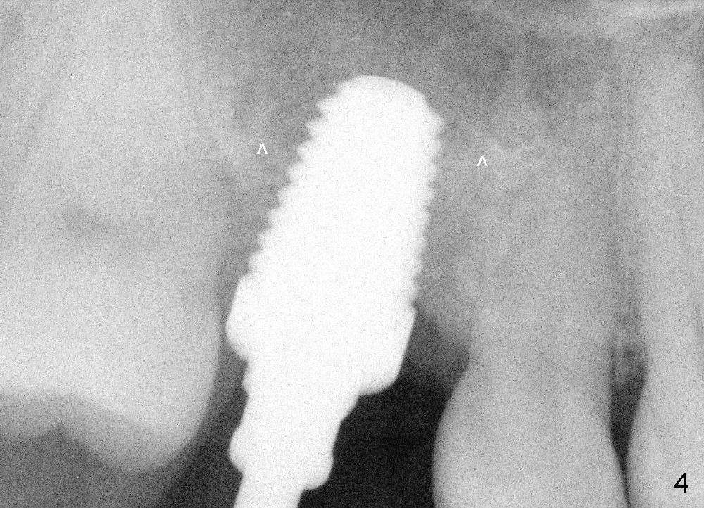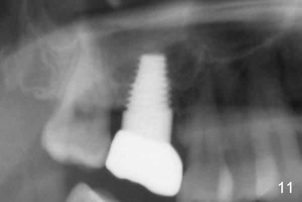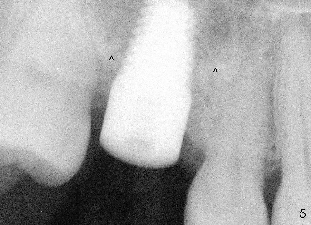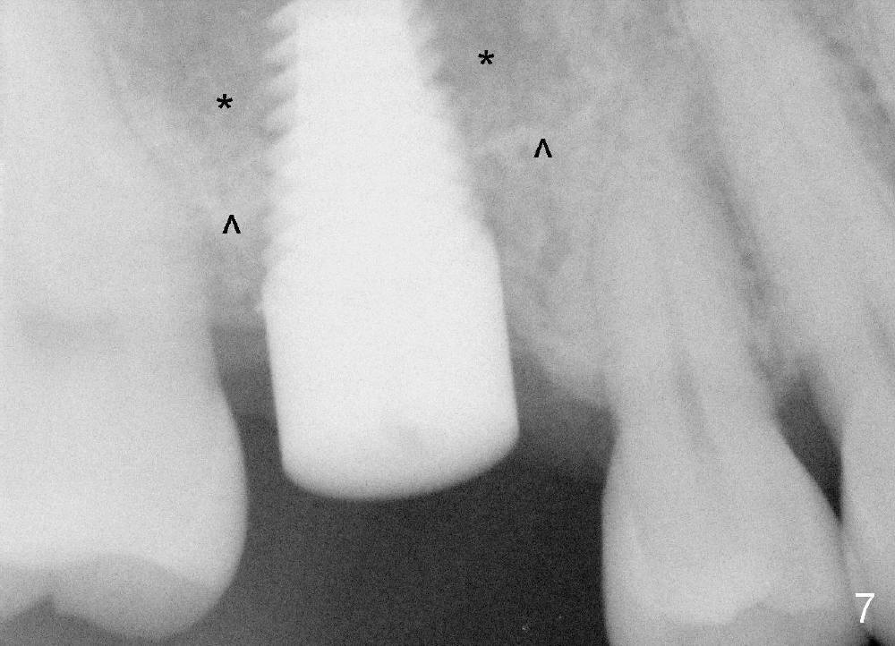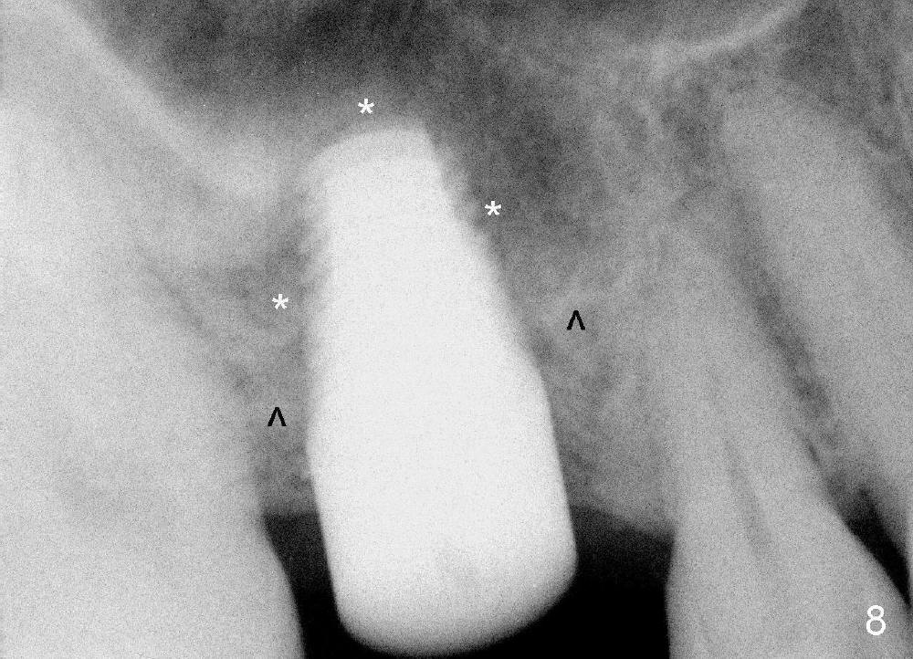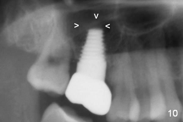 Our experience demonstrates higher failure rate associated with shorter implant in this situation. The depth of the osteotomy is then increased to 14 mm using the same series of osteotomes and taps. The bone at the top of the osteotomy finally wears off when the last tap is applied (7x17 mm). But the sinus membrane is intact. Osteogen is pushed into the osteotomy before placing a 7x14 mm implant with insertion torque > 60 Ncm (Fig.5). The implant contacts the gingiva tightly; no suture is necessary. There is no intra- or postop nasal hemorrhage. The wound heals 8 days postop (Fig.6). There is bone surrounding the apical portion of the implant in the sinus (Fig.7,8 *) 3.5 months postop. The implant is stable. There appears no crestal bone resorption 7.5 months post cementation (Fig.9 ^). Sinus lift is visible 16 months post cementation (Fig.10 (trimmed panoramic X-ray) arrowheads). There is discomfort between #2 and 3, probably due to poor oral hygiene. There is no deep pocket or bone loss (Fig.11, 26 months post cementation).