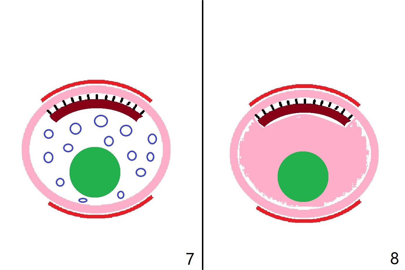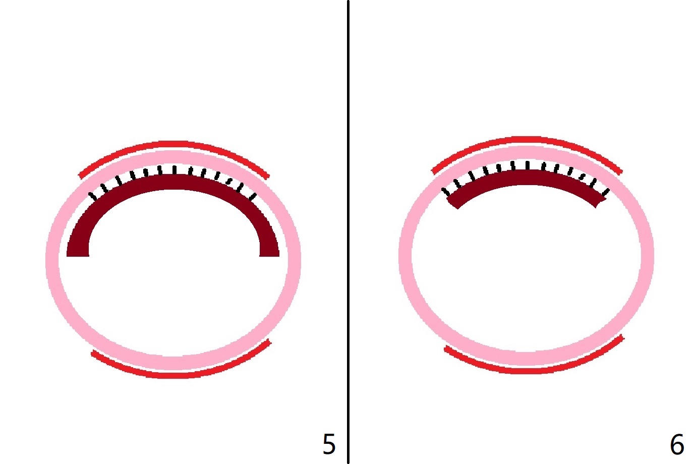 图一是单根牙横断面示意图:红线代表颊侧(B)和腭侧(P)牙龈,粉红色:牙槽骨;棕色:牙根;牙槽骨与牙根之间是牙周膜。保留部分牙根,即形成牙槽窝盾(图二),便保存牙周膜,颊侧骨板血供不受影响,不发生拔牙后骨板吸收塌陷。