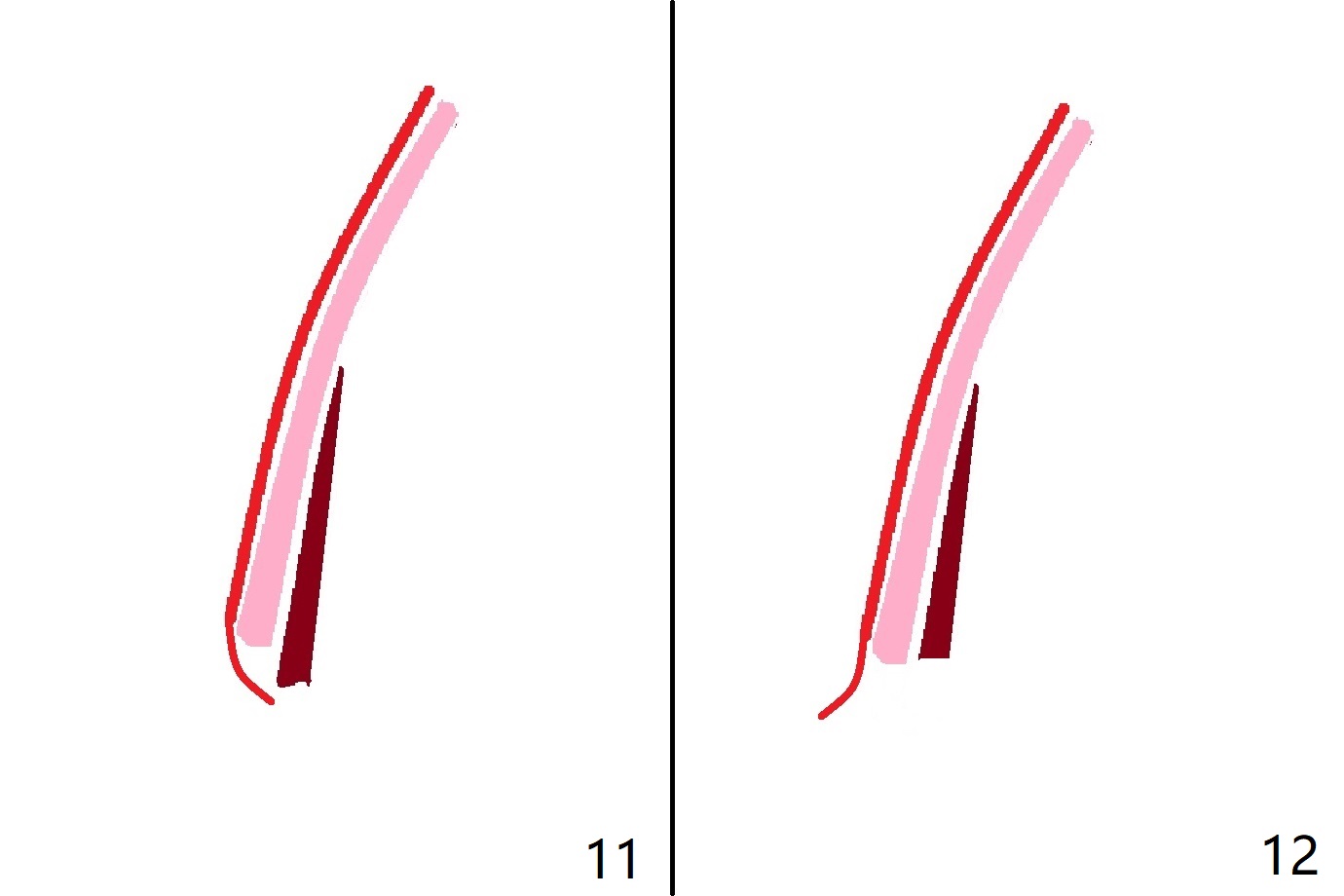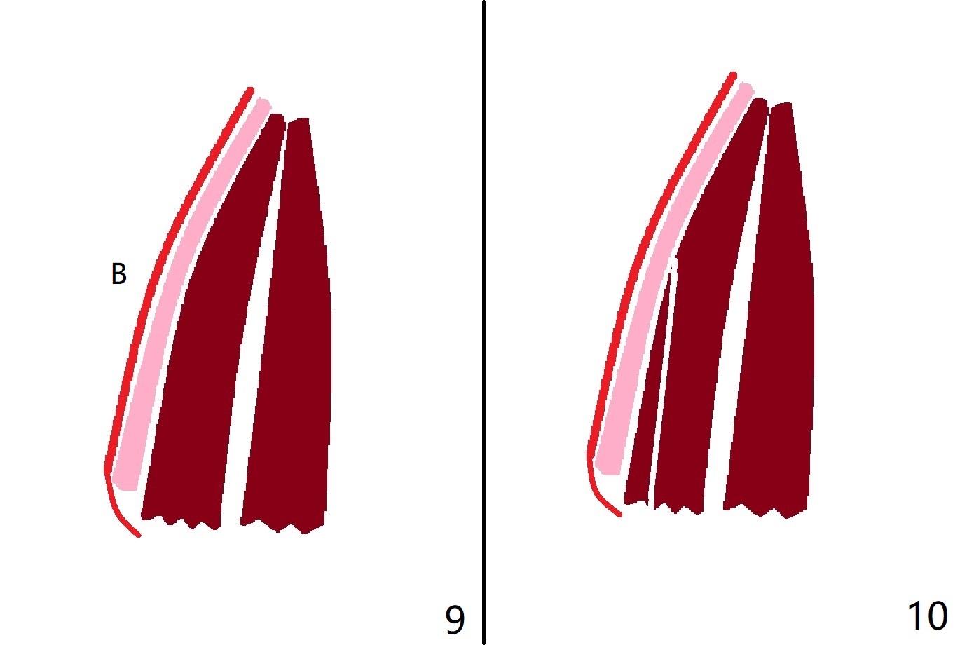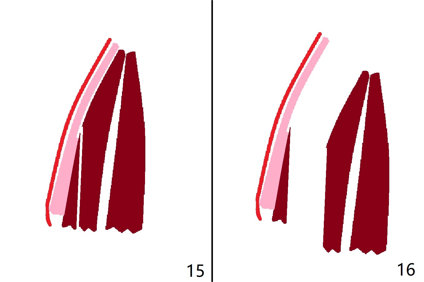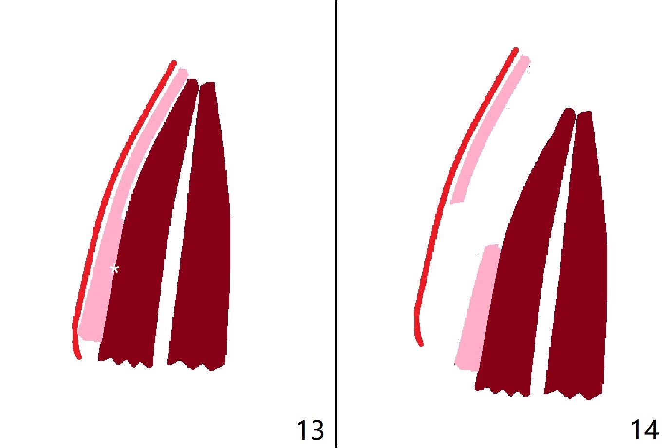 图九是断裂牙根冠状切面(棕色),颊侧骨板(粉红色)和颊侧牙龈(红色)。可以一次切断牙根(图十:白色),用手指按着颊侧牙龈,防止或者减少穿孔。拔除腭侧牙根(图十一);使用特殊牙龈牵引器,将盾磨短(图十二)。偶尔颊侧骨板与牙根之间没有牙周膜,产生粘连(ankylosis,图十三:* ),拔牙时,折断牙槽骨(图十四),在没有事先准备粘性骨粉下,修复困难。其实盾只有在这种特殊情况下作用最大(图十五,十六)。