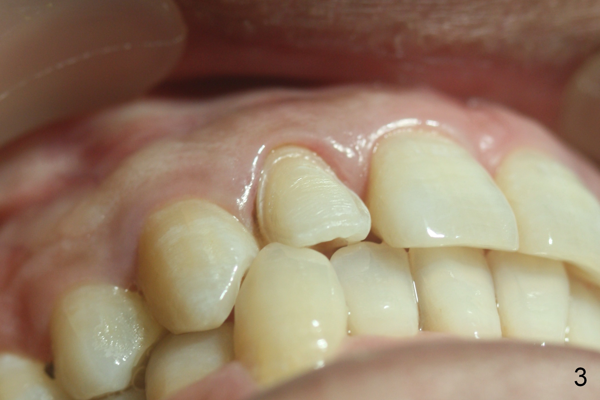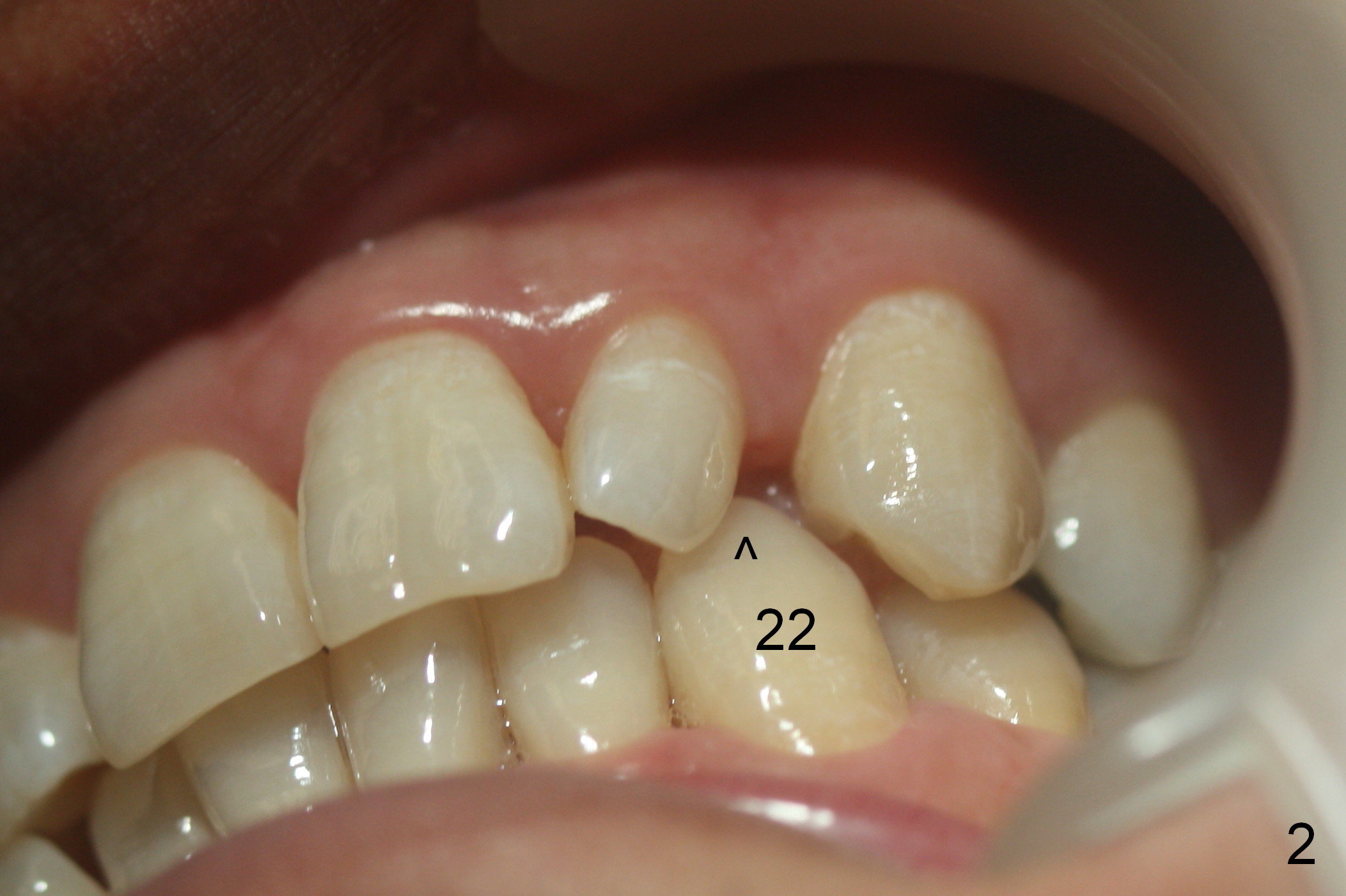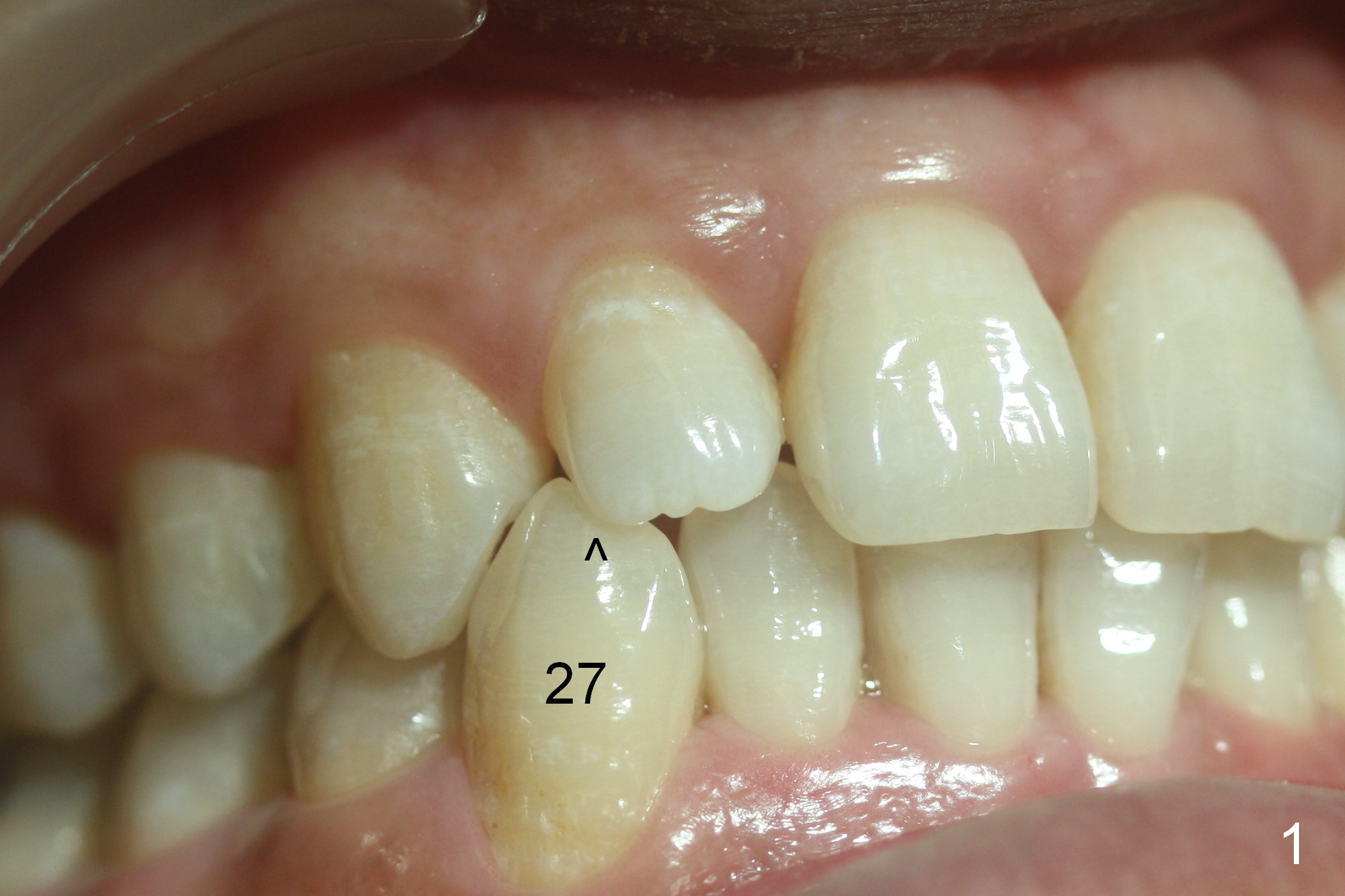 A 36-year-old man (YD) has peg laterals and wants to improve the appearance. To make the laterals look wider and longer, the interference on the opposing teeth (#22,27 in Fig.1,2) may need to be removed (^). Please make note of such adjustment. It seems that pre-prosthetic orthodontic treatment is more ideal.