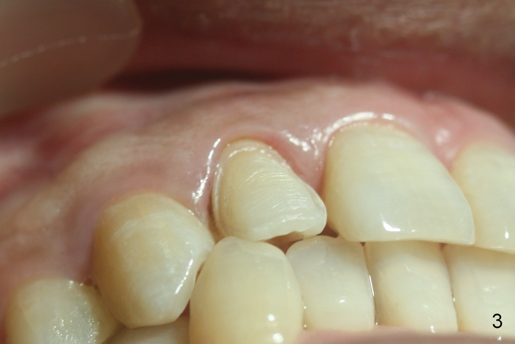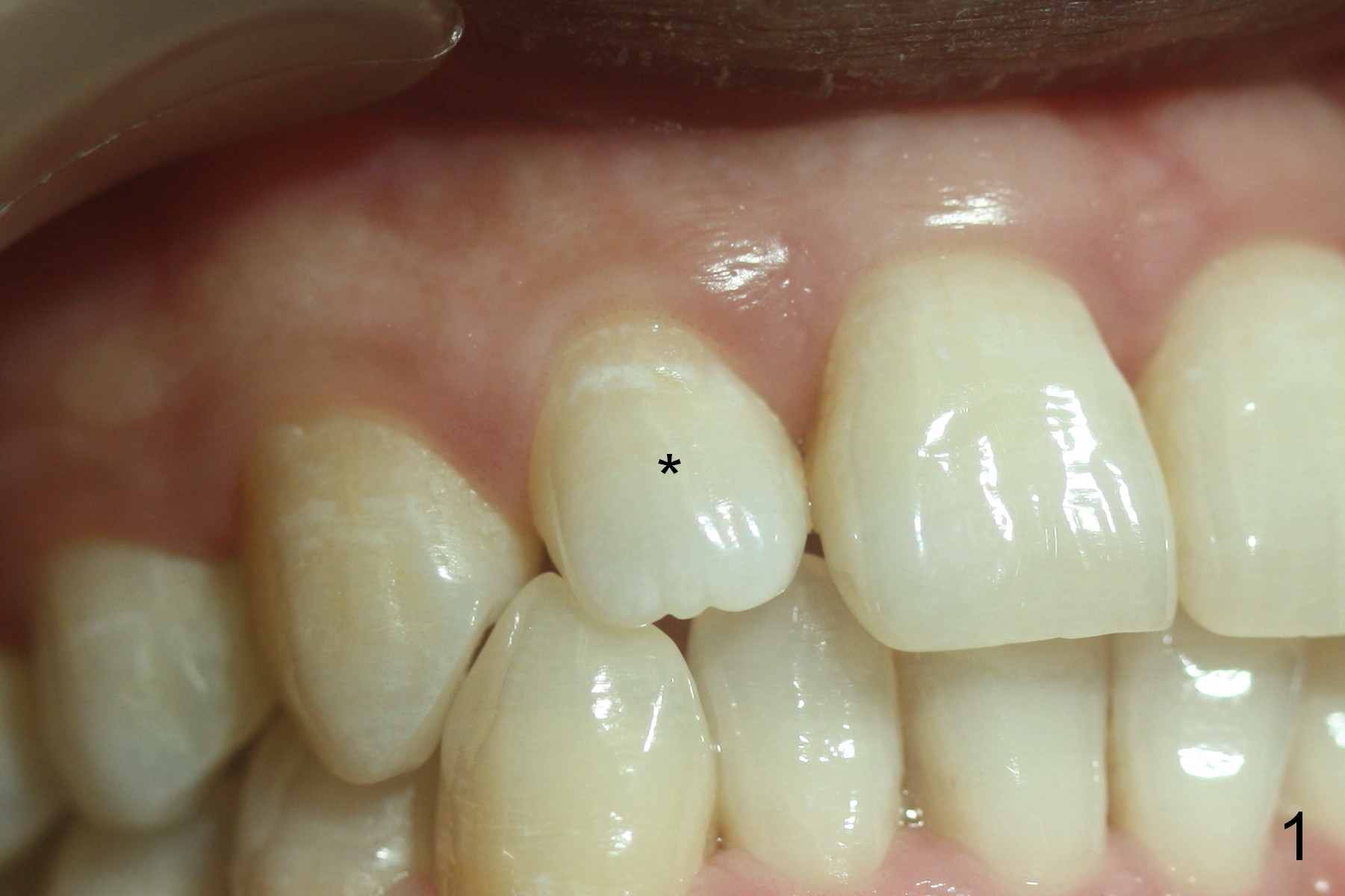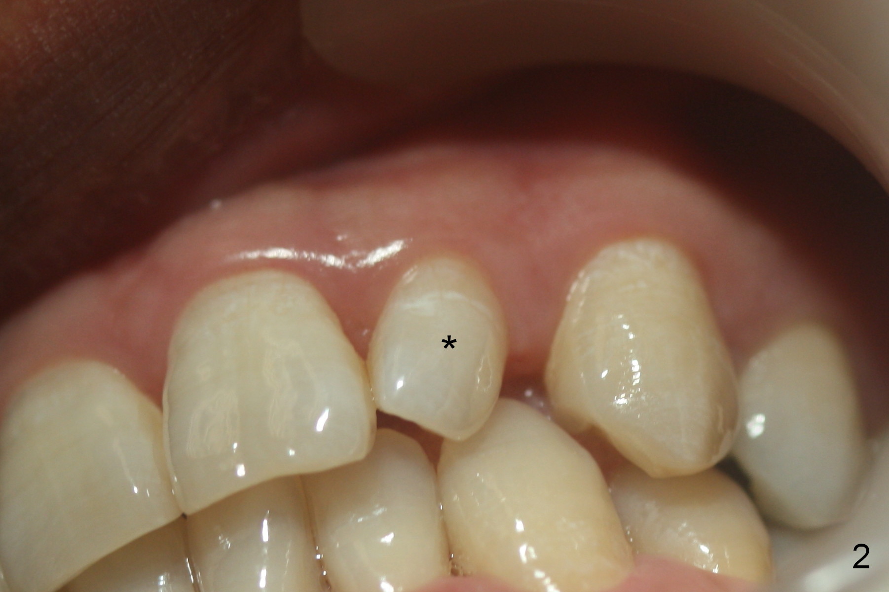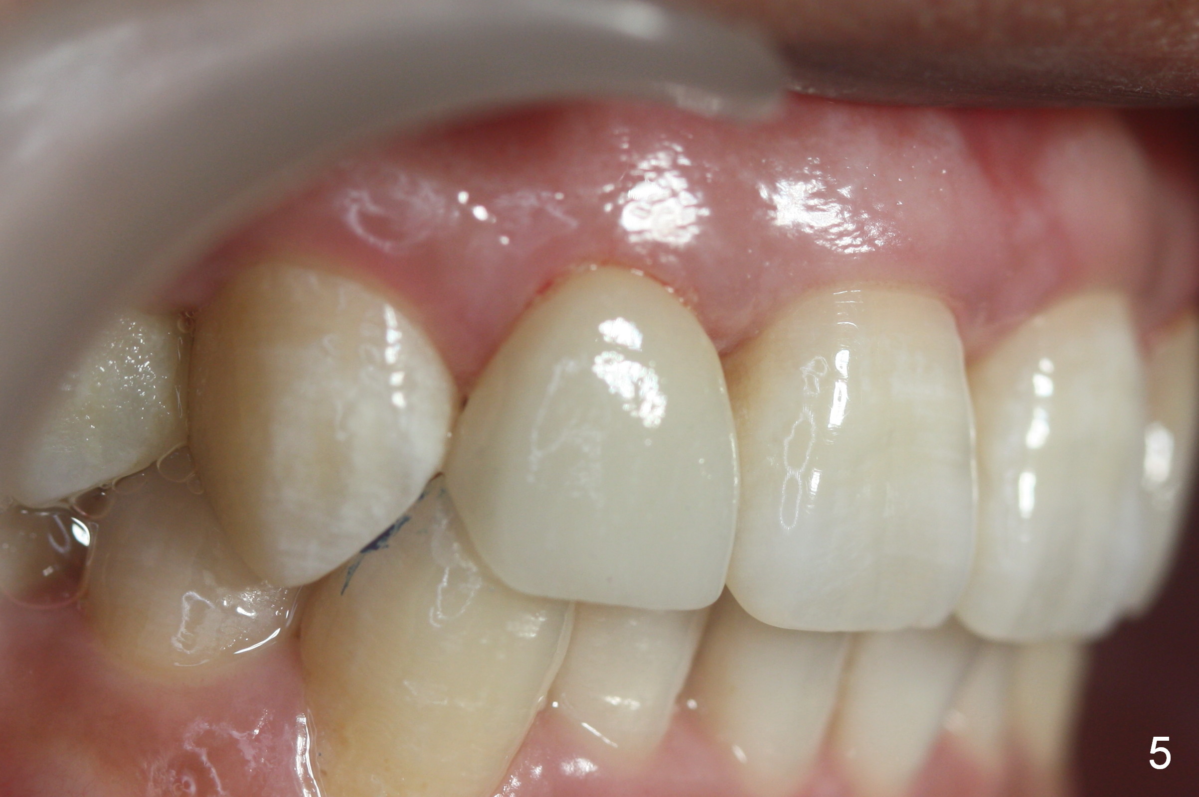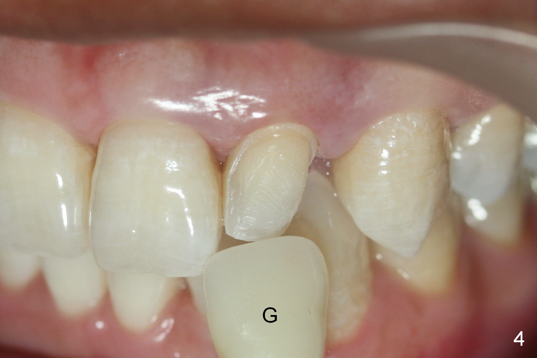 A 36-year-old man has 2 small, congenitally deformed lateral incisors (peg laterals, Fig.1,2 *). After discussion, we choose porcelain veneers for cosmetic makeup. The teeth need minor shaving (Fig.3,4); right colors are being selected with a shade guide (Fig.4: G). The shaving is so conservative that there is no pain during the procedure and there is no need to make temporary veneers. One to 2 weeks later, porcelain veneers are cemented (Fig.5,6). The patient is satisfied.