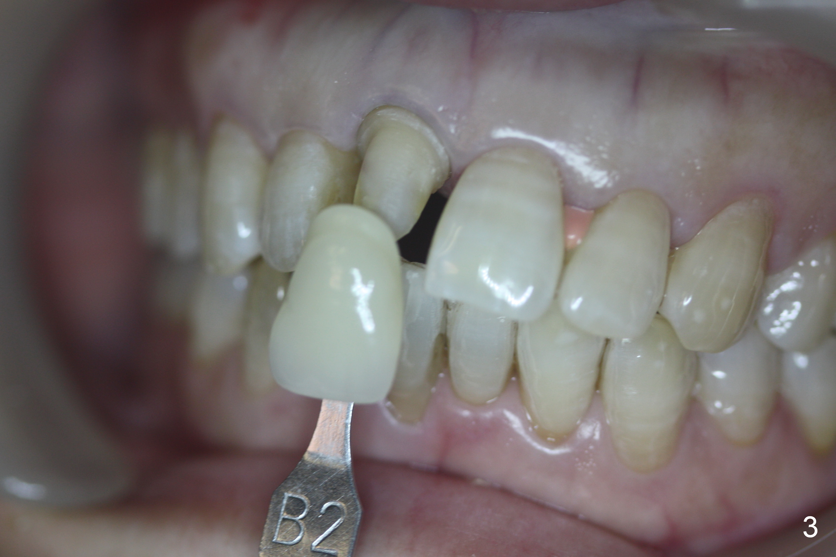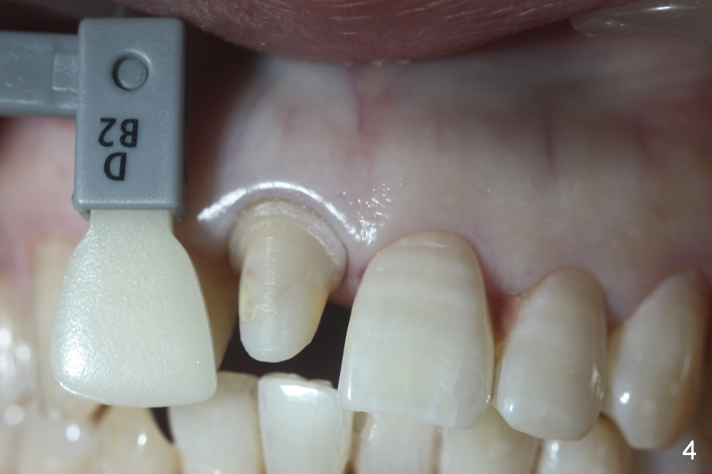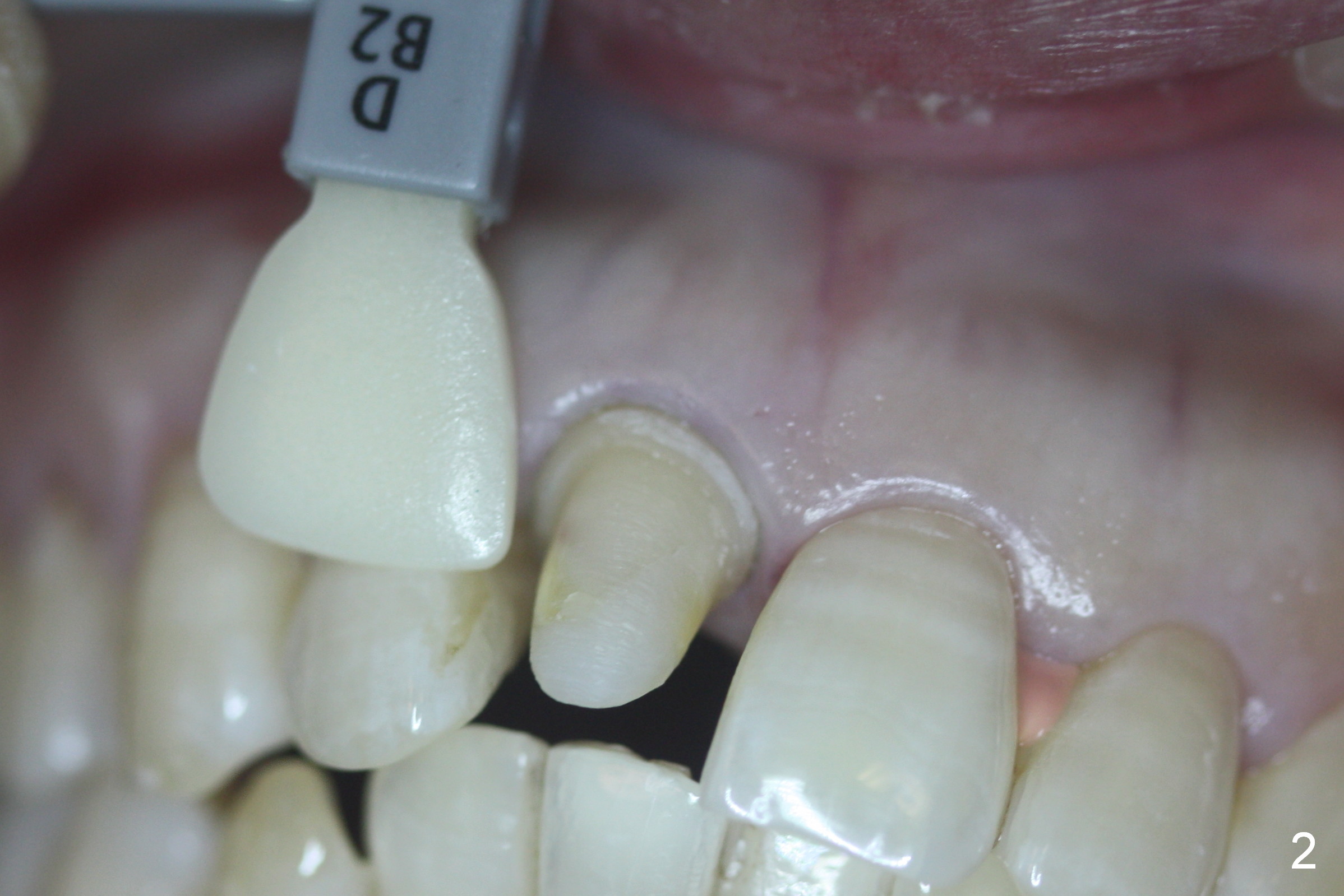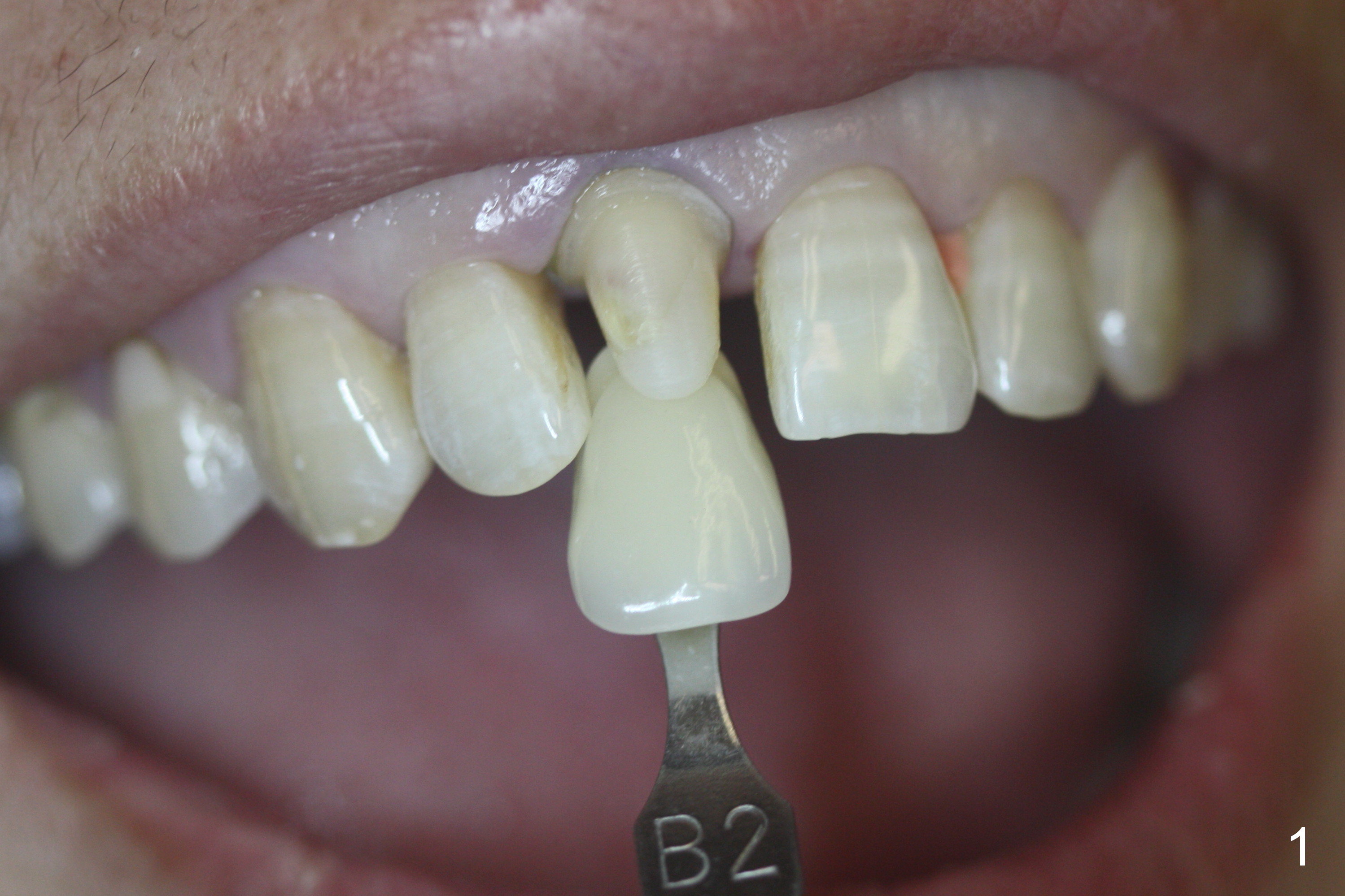 A 50-year-old woman fractured the upper right central incisor on fall in the ground. Crown is prepared after composite build up. Please paint stripes in the crown.