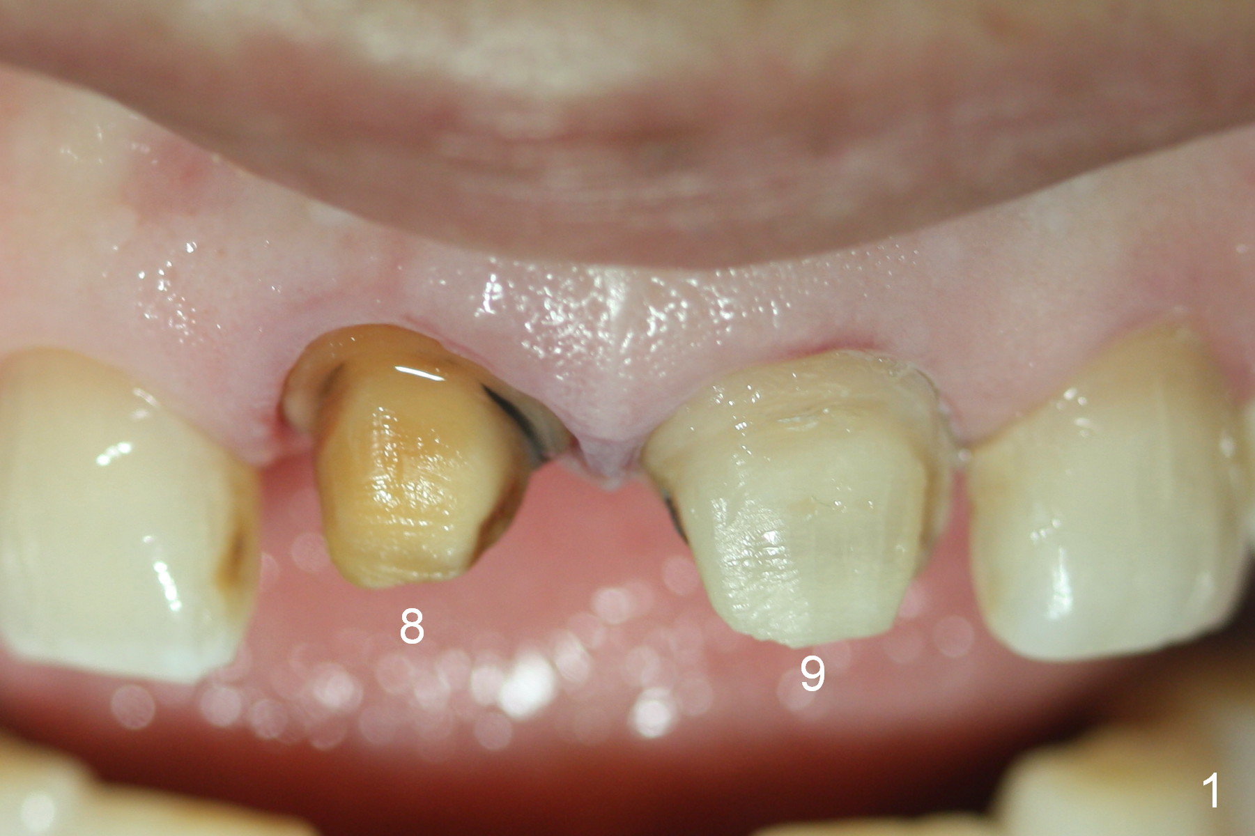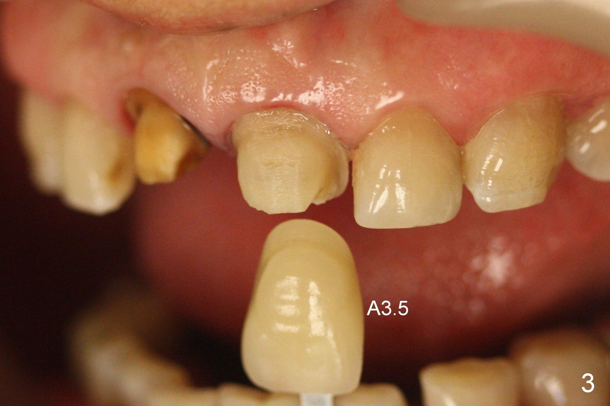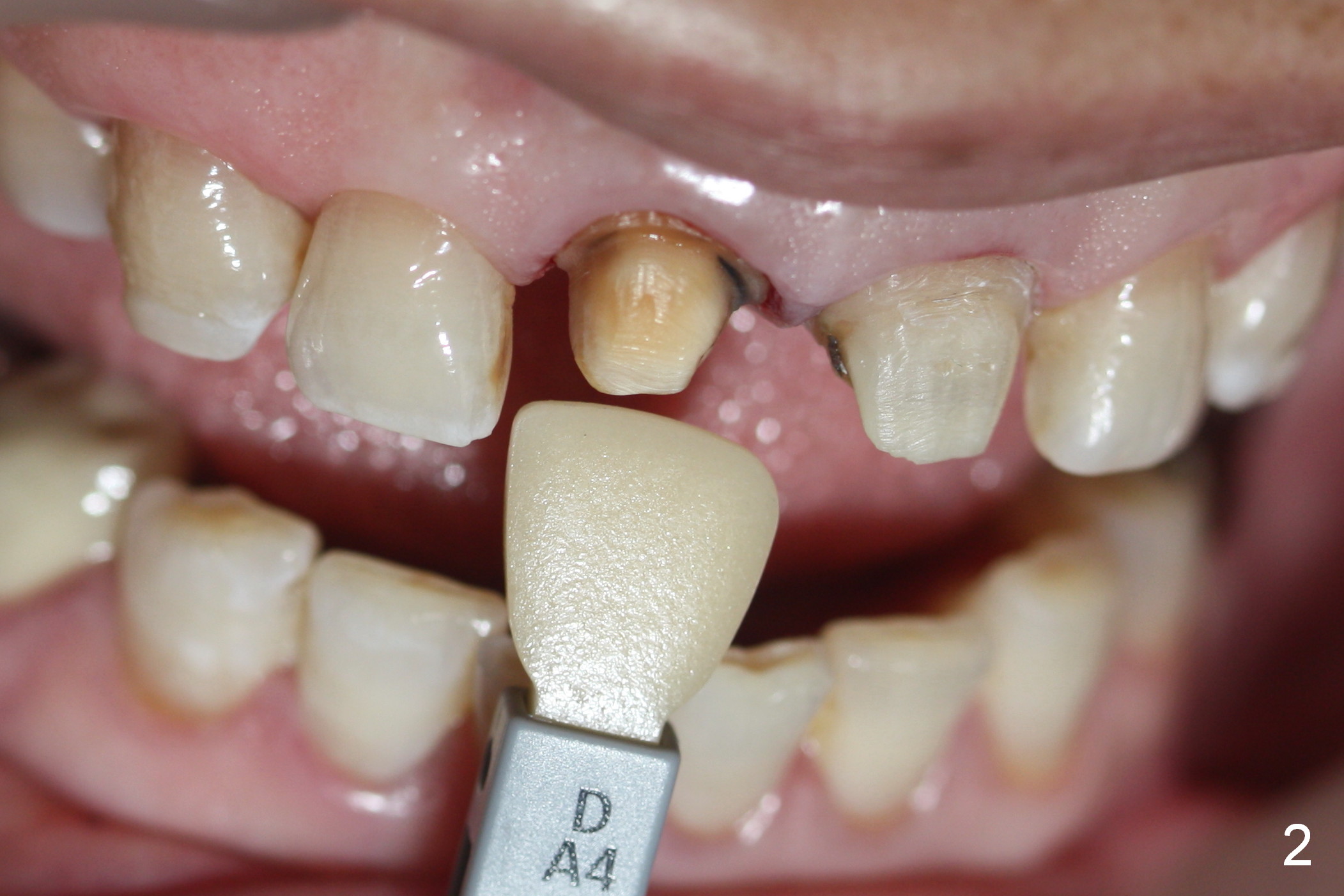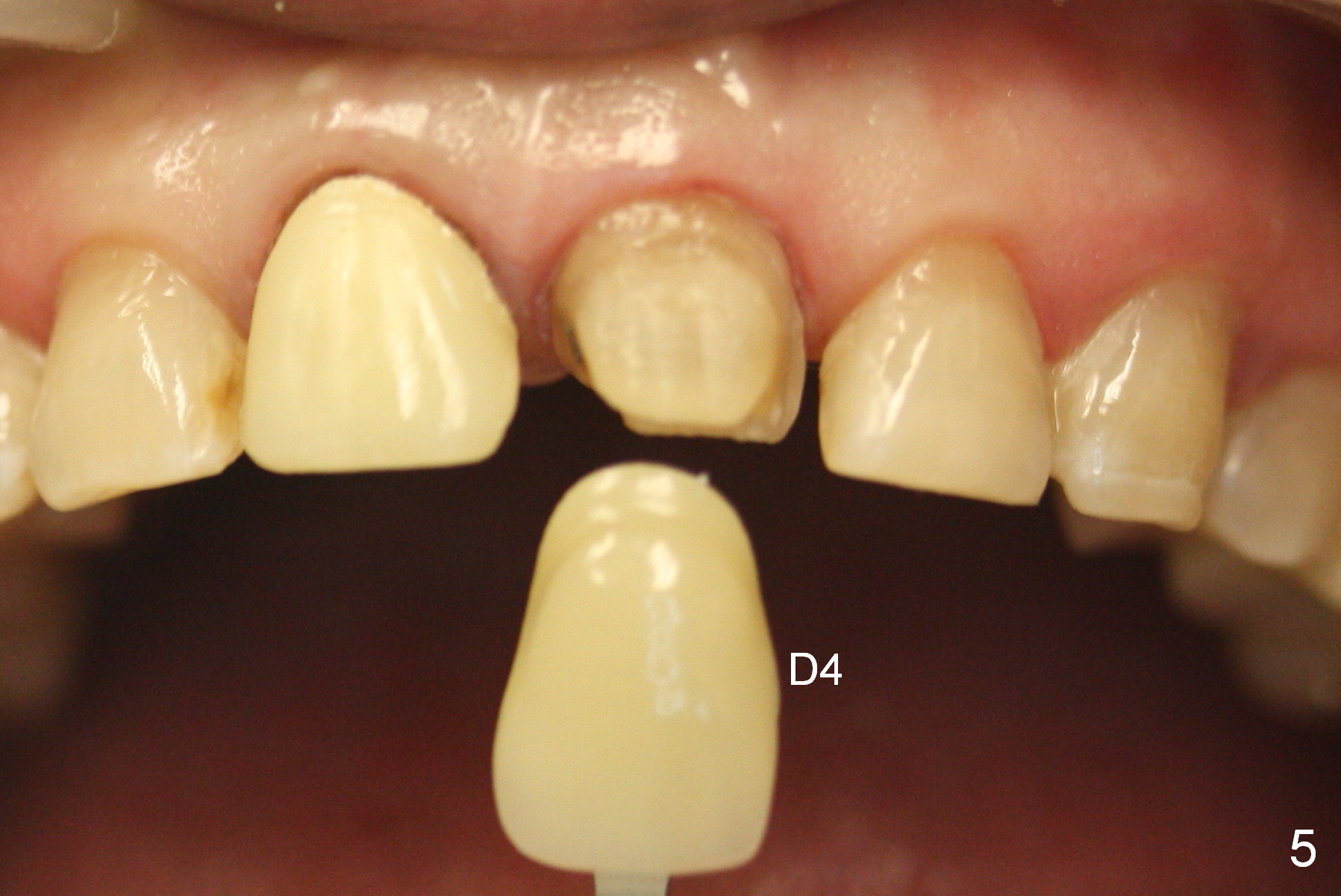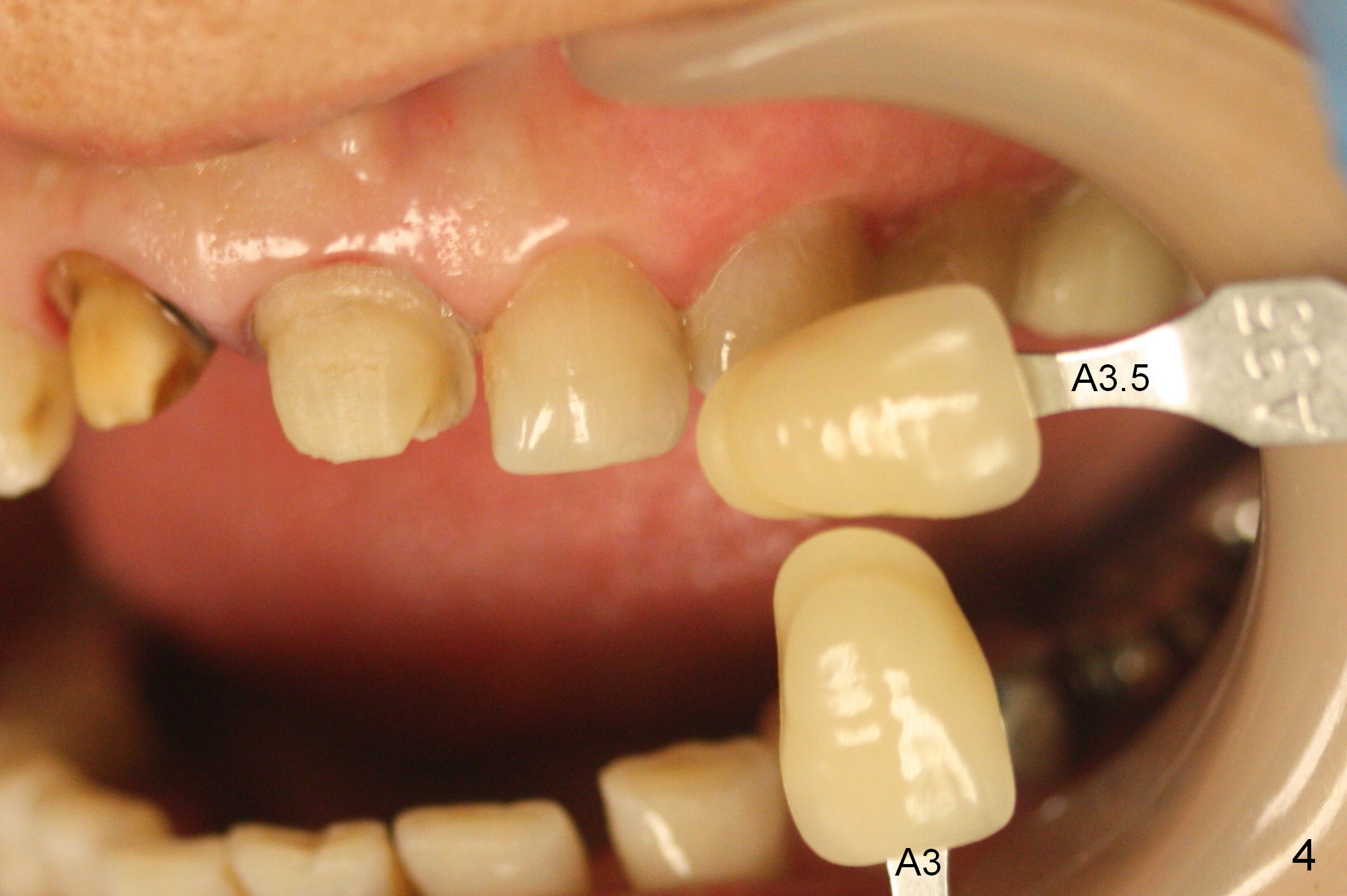 A 54-year-old lady (CL) has a discolored central incisor (#8, Fig.1). Stump shade is shown in Fig.2. Other reference shades are shown in Fig.3-5.