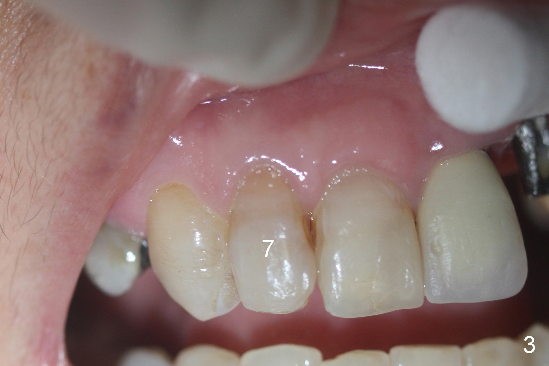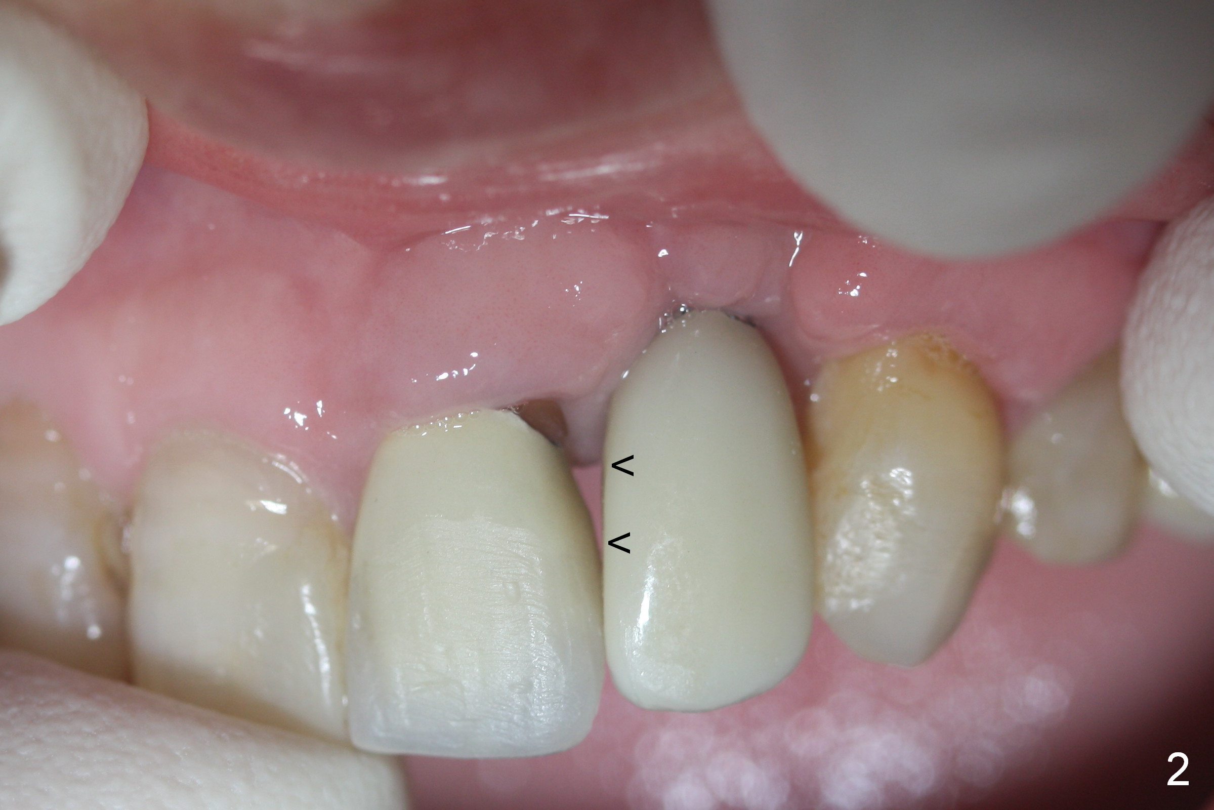Mrs. Chen likes the shape of the temporary crown (Fig.1), particularly the mesial portion (arrowheads). Change the shape of the permanent crown (Fig.2 arrowheads) to alleviate the problem of papillary recession. Use the tooth #7 as a reference (Fig.3).