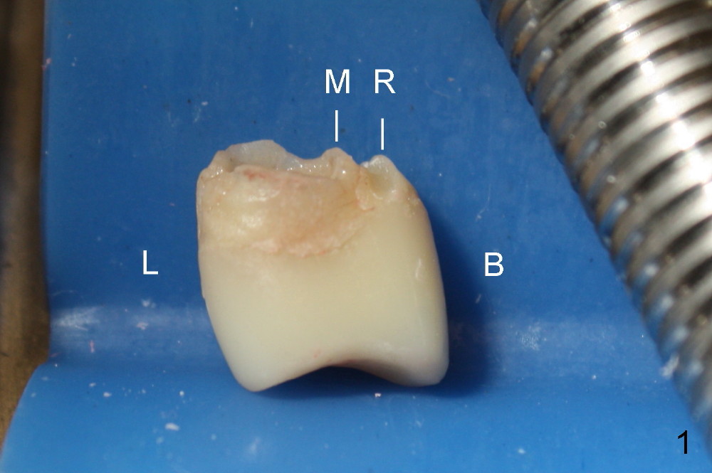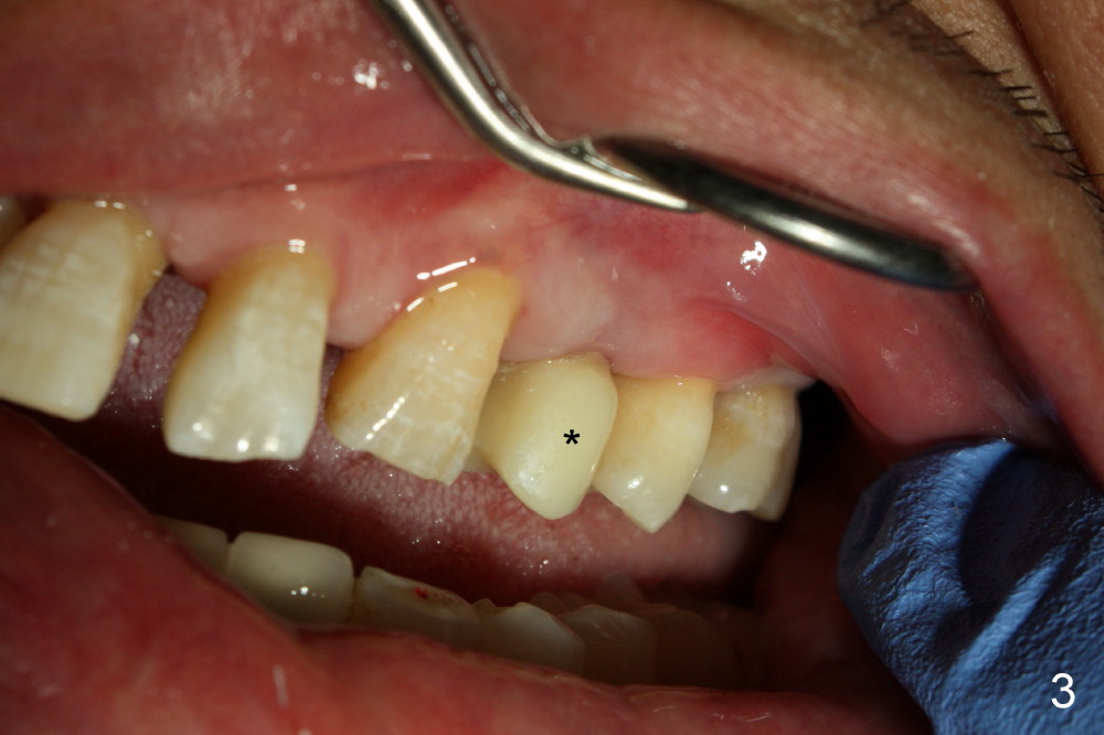 A temporary crown is fabricated for an upper left 1st premolar implant (Fig.1). There is a problem. The implant is placed a little too lingual (L). An extra ridge (R) is made buccal (B) to the buccal margin (M). Although the ridge improves cosmetics, it is not hygienic. Cement and food debris accumulates between the margin and ridge and it is difficult to clean. A smooth buccal margin is preferable (Fig.2). The temporary crown without ridge does not look too bad after cementation (Fig.3 *). The cervical area looks like a Class V defect. It will not get worse.