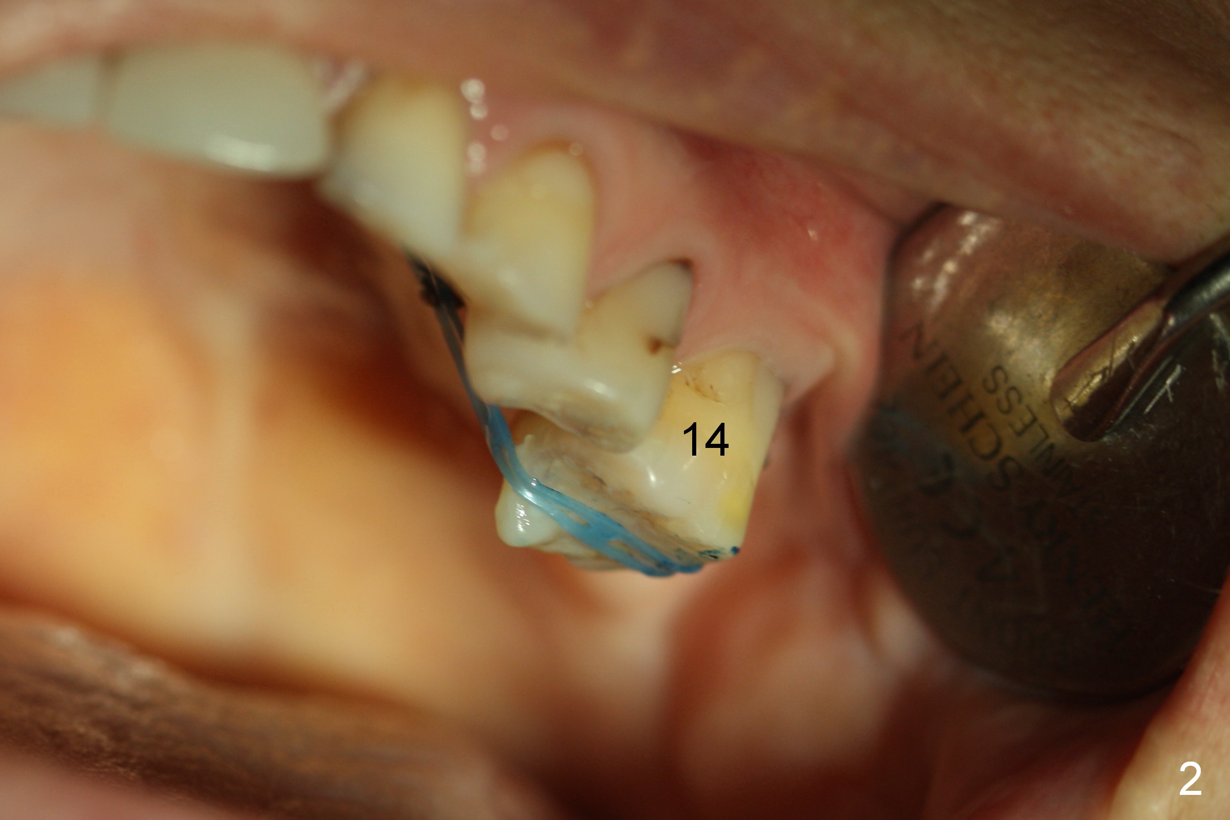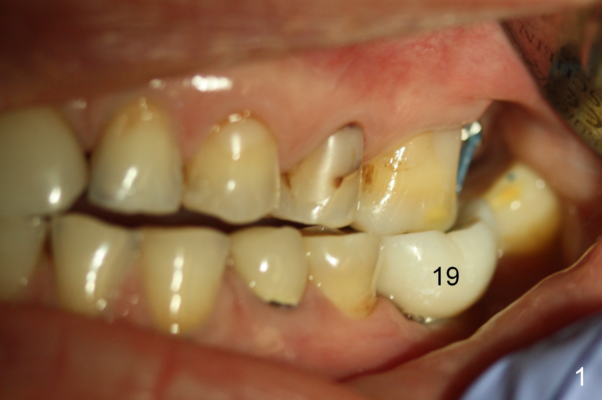 A 50-year-old lady had implant crown prep on 02/02/2015. The intrusion of the opposing tooth was terminated (removing power chain). She returned for crown cementation today (02/27/2015). The temporary crown was broken for an unknown period of time. When a Zirconium crown is seated at the site of #19, the rest of occlusion is off (Fig.1). The contact with the neighboring teeth is within normal limit.